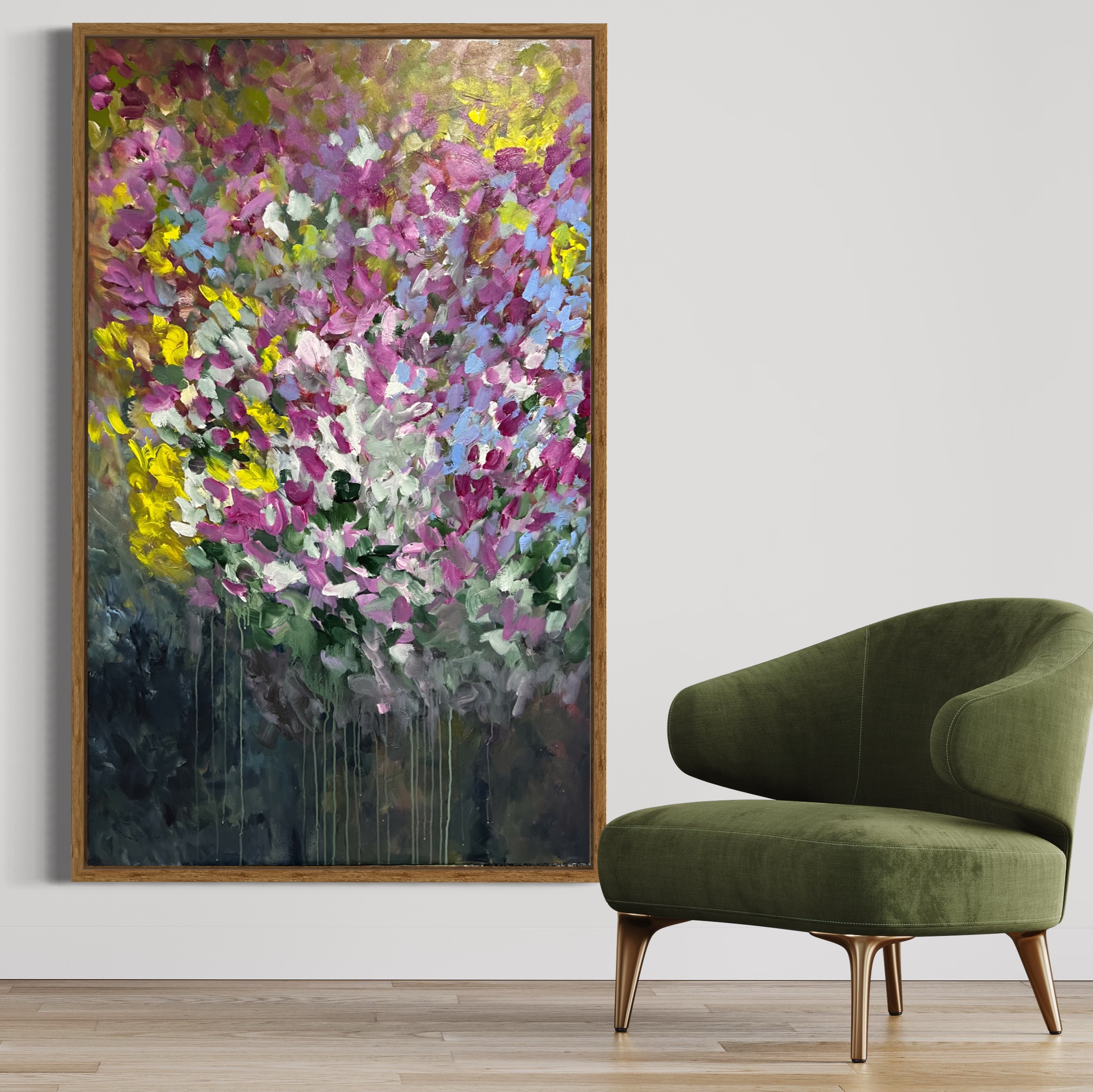 My abstract artworks especially with floral impressions from memory complete my creative journey, making it soulful and I believe that fulfilling experience can be felt in my works freely. I love painting with vibrant colors, using hands and loose strokes of brushes, palette knives and unusual tools of craft in the process of layer building. These play an amazing role in enhancing the depth of composition.