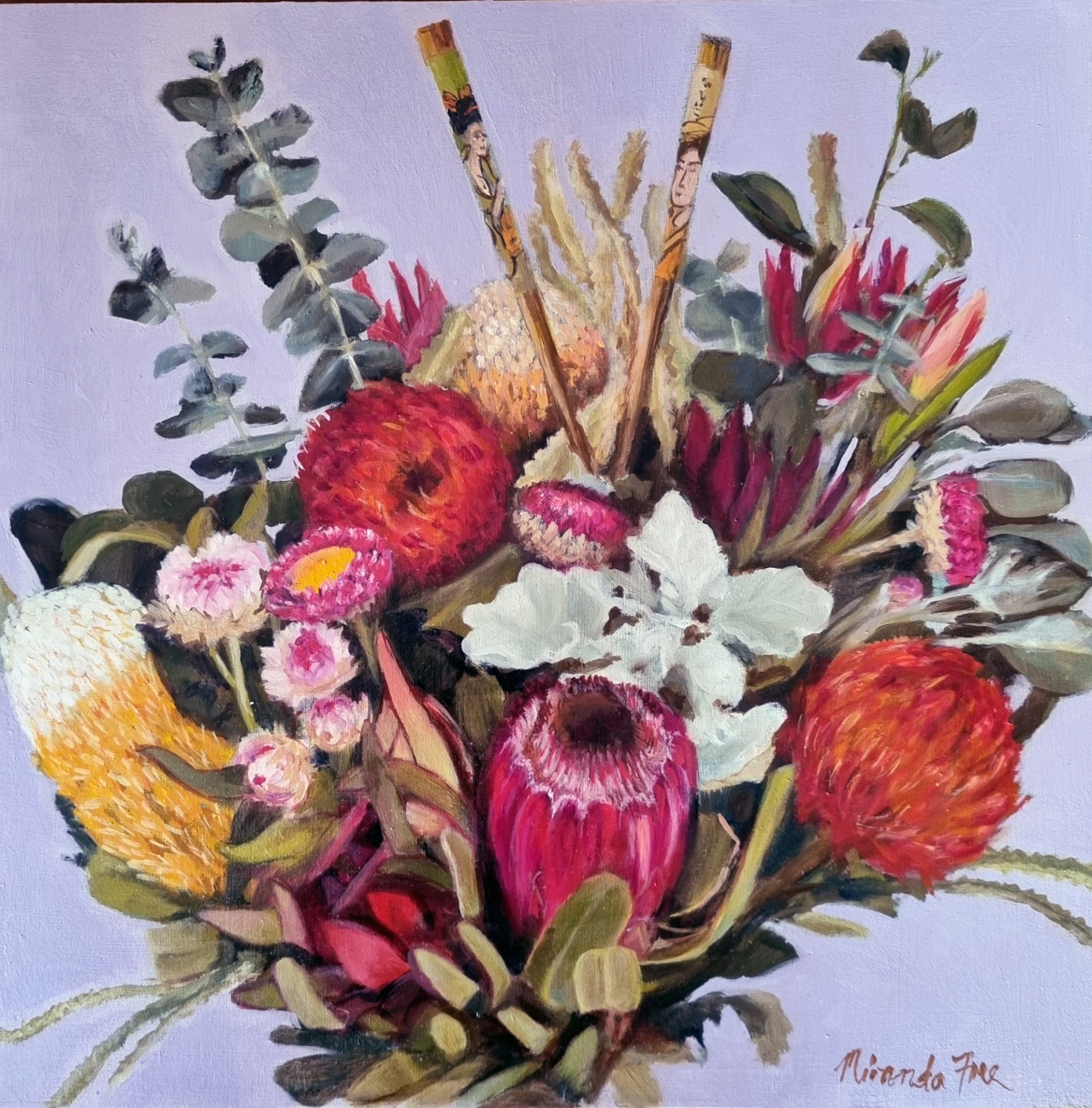 A lovely bunch of native flowers humorously incorporating chopsticks hence the title of the work. Painted in vibrant oils to create a colourful piece that would brighten an intimate spot in any home. Â Finished with a pale timber box frame.
