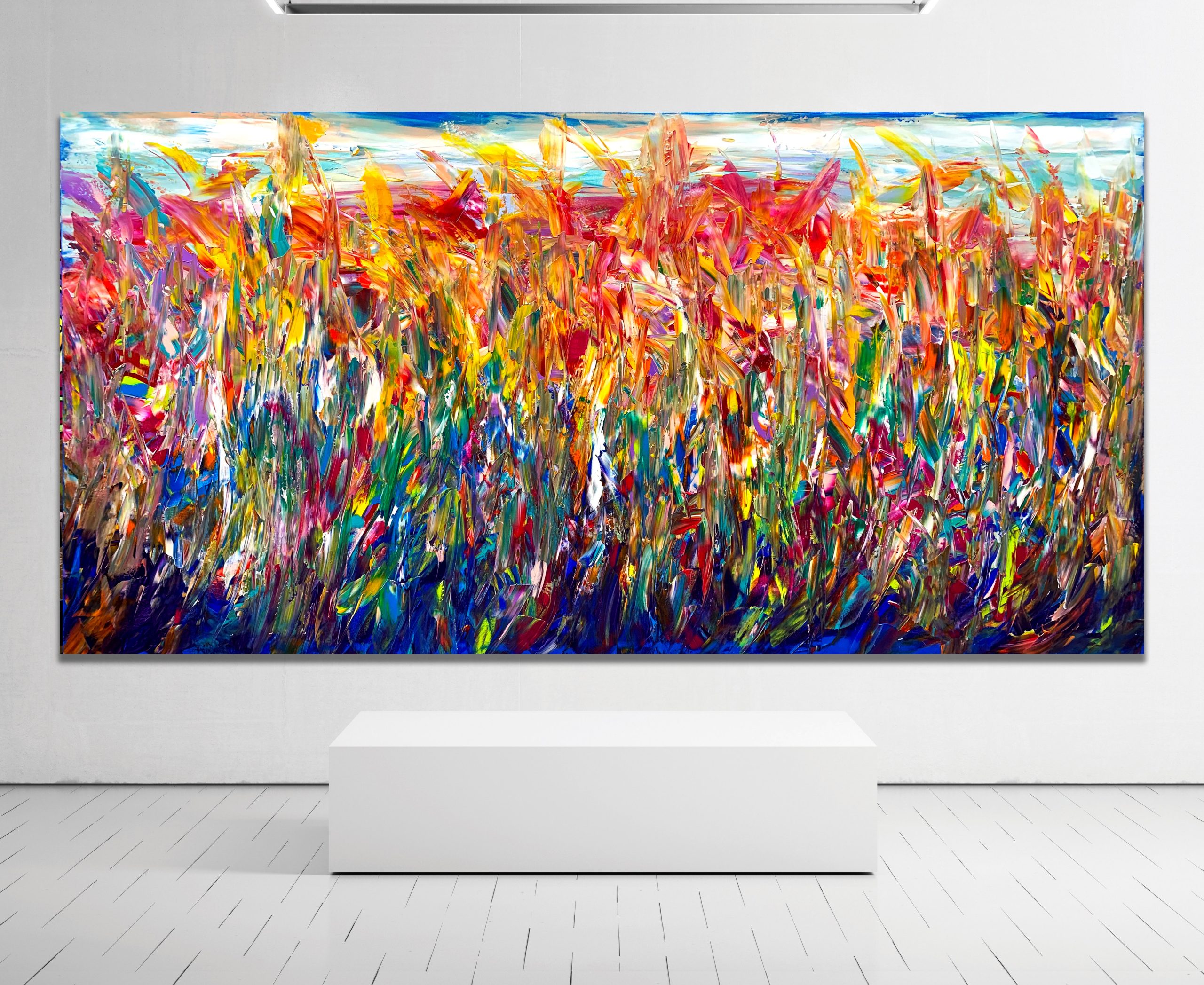 This work is painted on professional-grade canvas stretched and has been sealed with varnish. The canvas has dimensions is 214 cm in width by 107 cm in height. The painting is painted blue on the sides so there is no need for a frame.