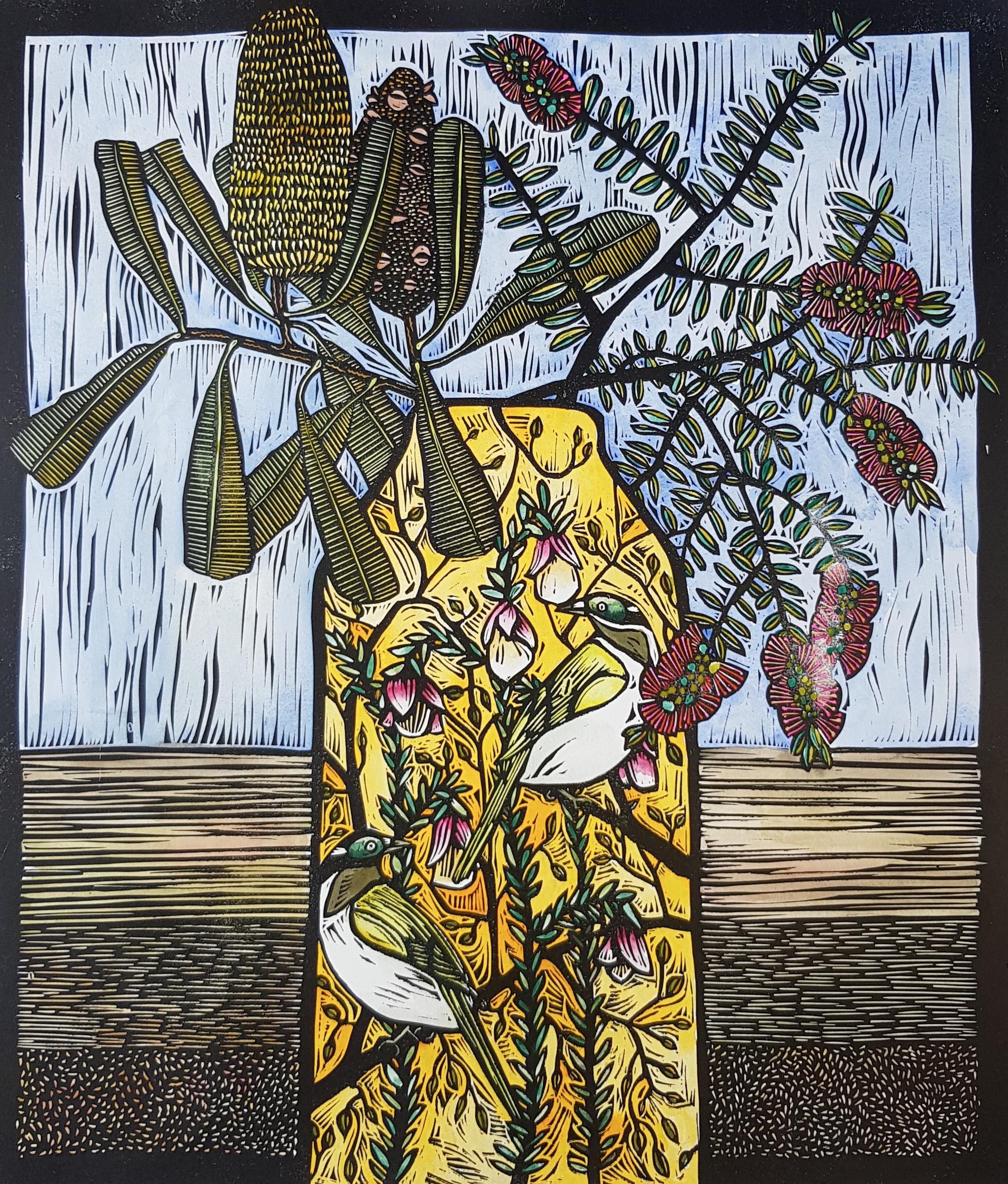 Bluefaced honeyeaters and qualup bells adorn the vase which is filled with banksias and bottlebrush flowers which make up this still life. The vase going infront of the border giving a dramatic depth to the image.