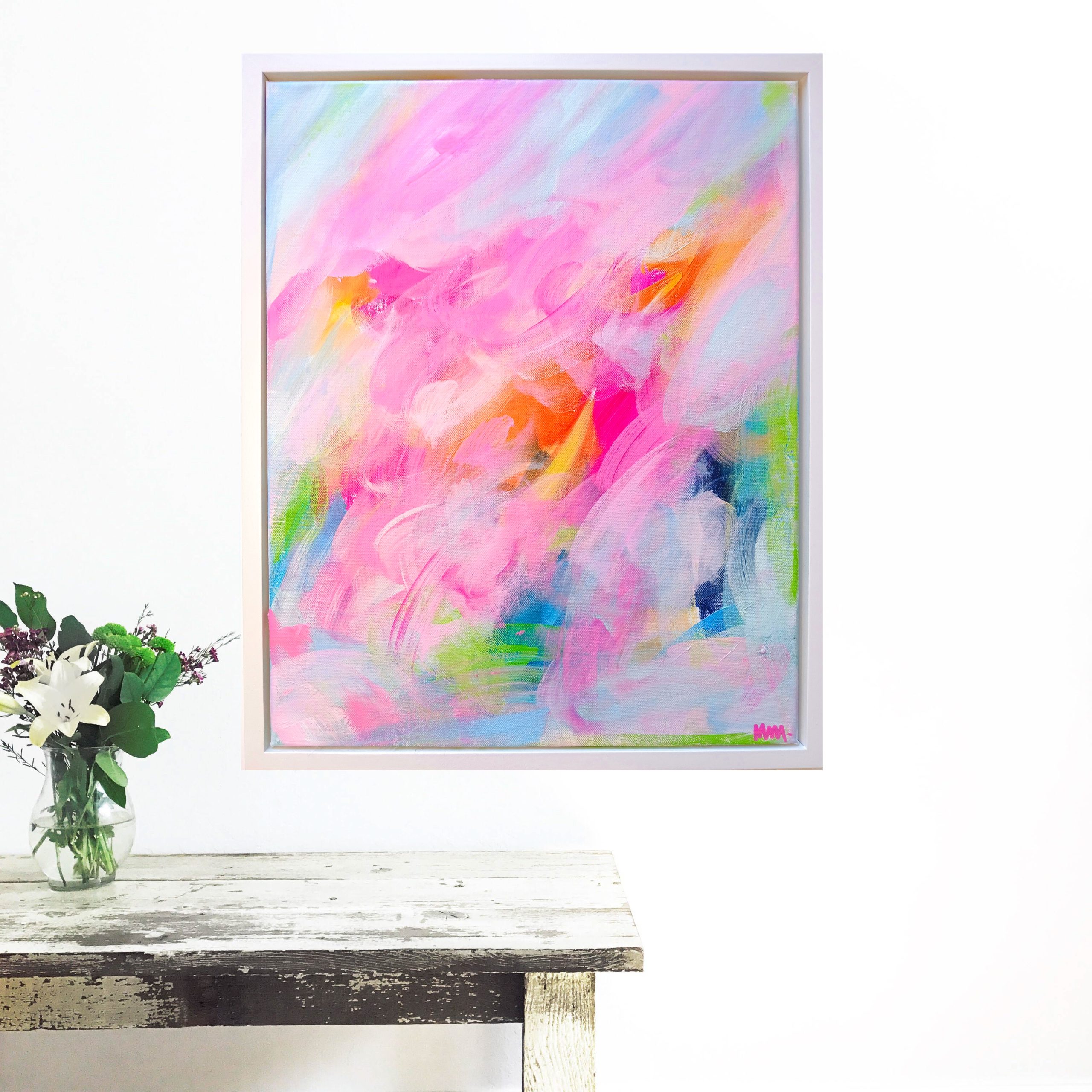 Acrylic on hand stretched canvas framed in a white floating frame.
