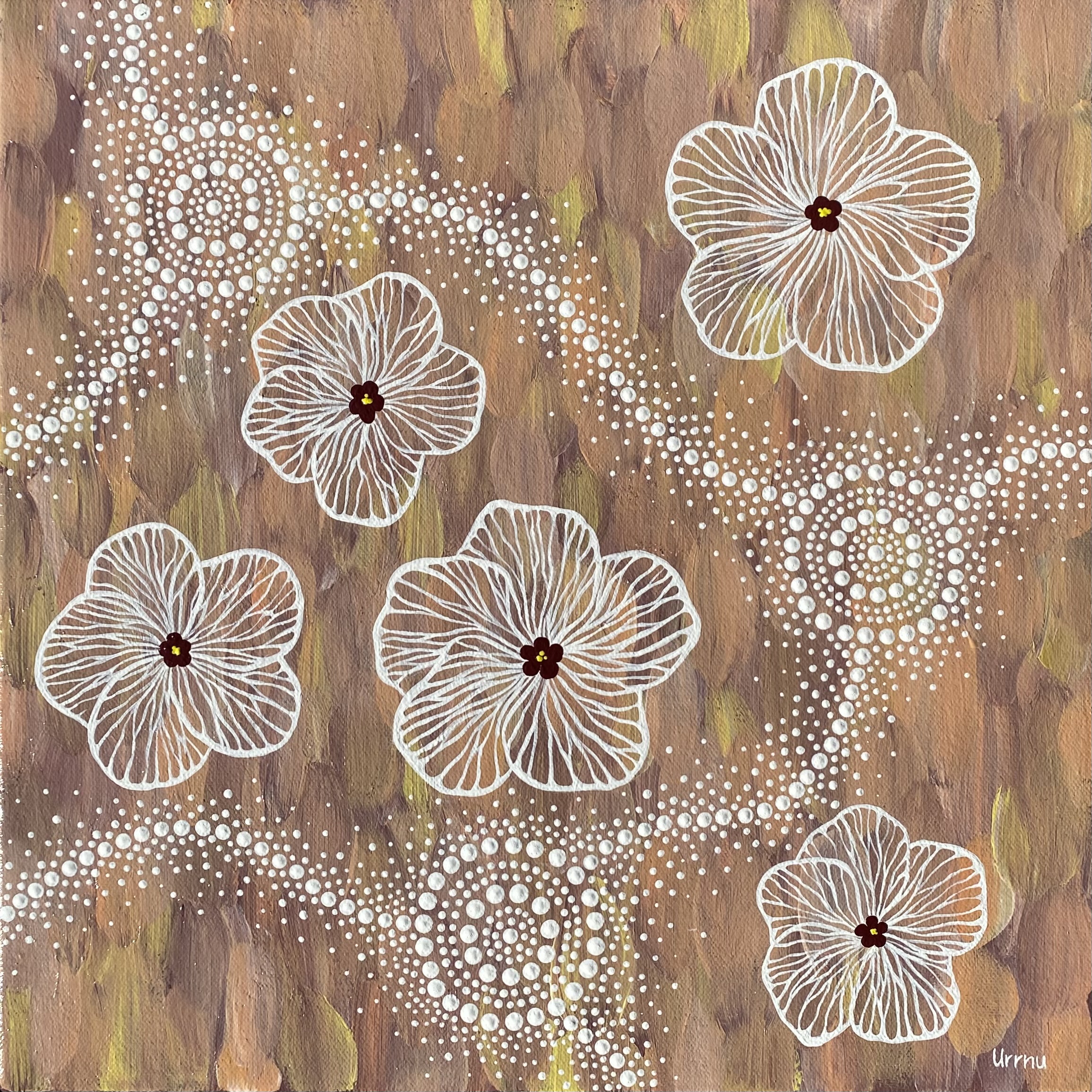 The Native hibiscus or cottonwood tree has many uses for the Kuku Yalanji people. At first bloom they are yellow then turn into a pink/red colour before they fall. Canvas size 30cm x 30cm.