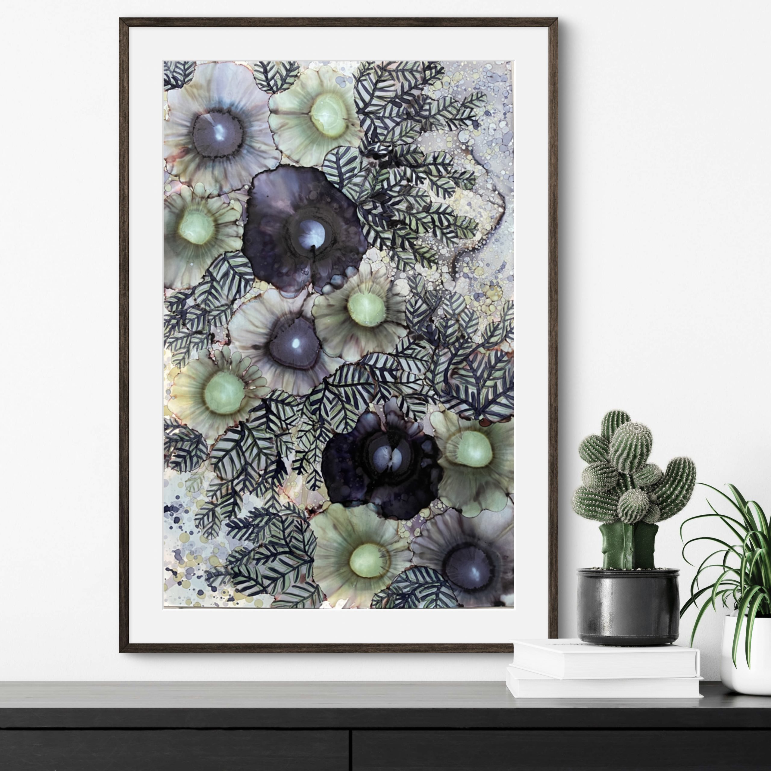 Framed in a black timber, artwork mounted on foam core, behind UV art glass.