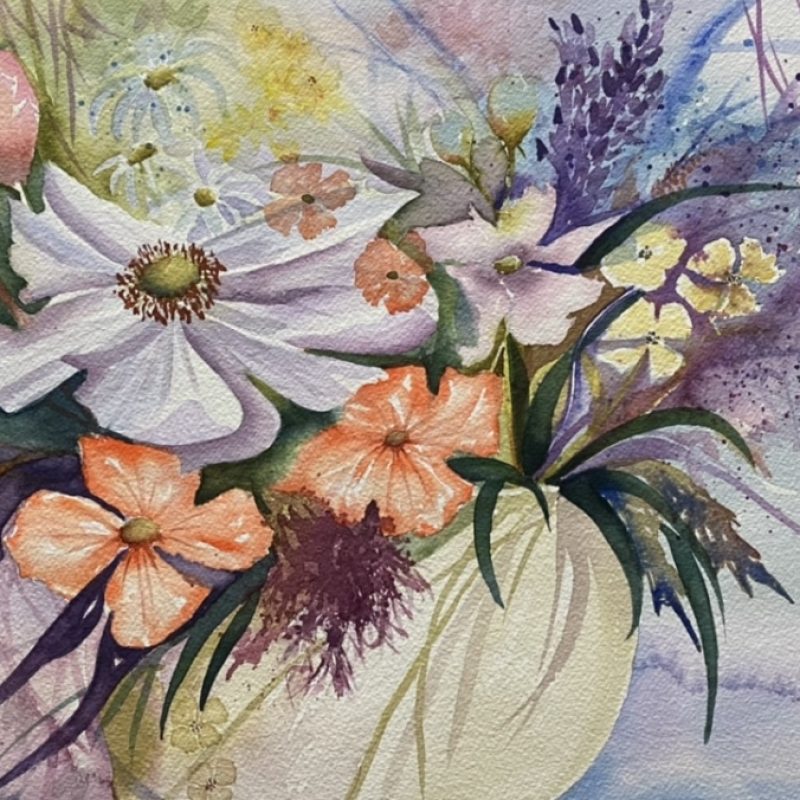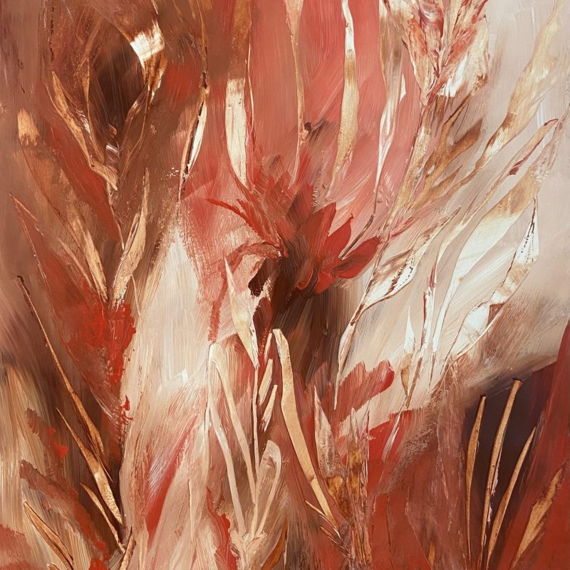 This artwork is another of my paint pouring pieces. The base is a paint pour with my love of nature and flowers painted in bright and bold colours over the base.