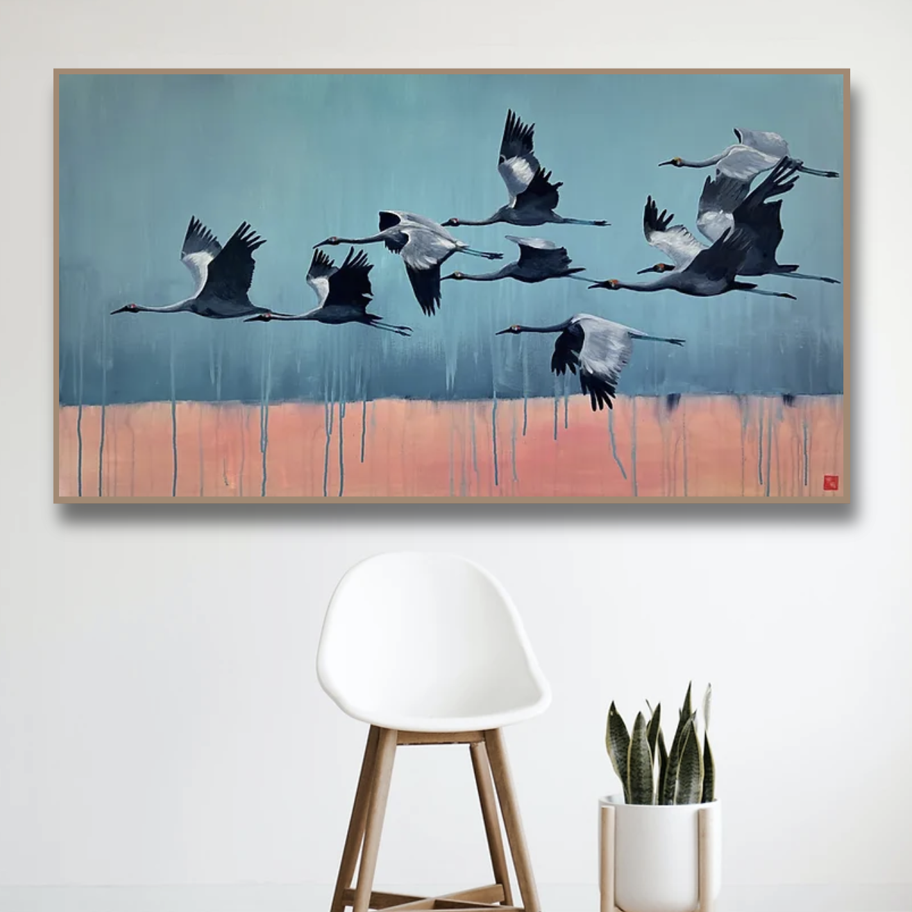 Feng shui intention: Brolgas are said to dance and flow. Here are a group of Australian Brolgas, beautiful grey graceful birds from the crane family, well known for movement, dance and flow. The brolgas are painted on an abstract backdrop to accentuate the flow of the flock and to provide a contemporary look for any modern home or business. The intention of this painting is to bring flow into your life, the delight of being “in the zone” or “in the groove” – the flow state.