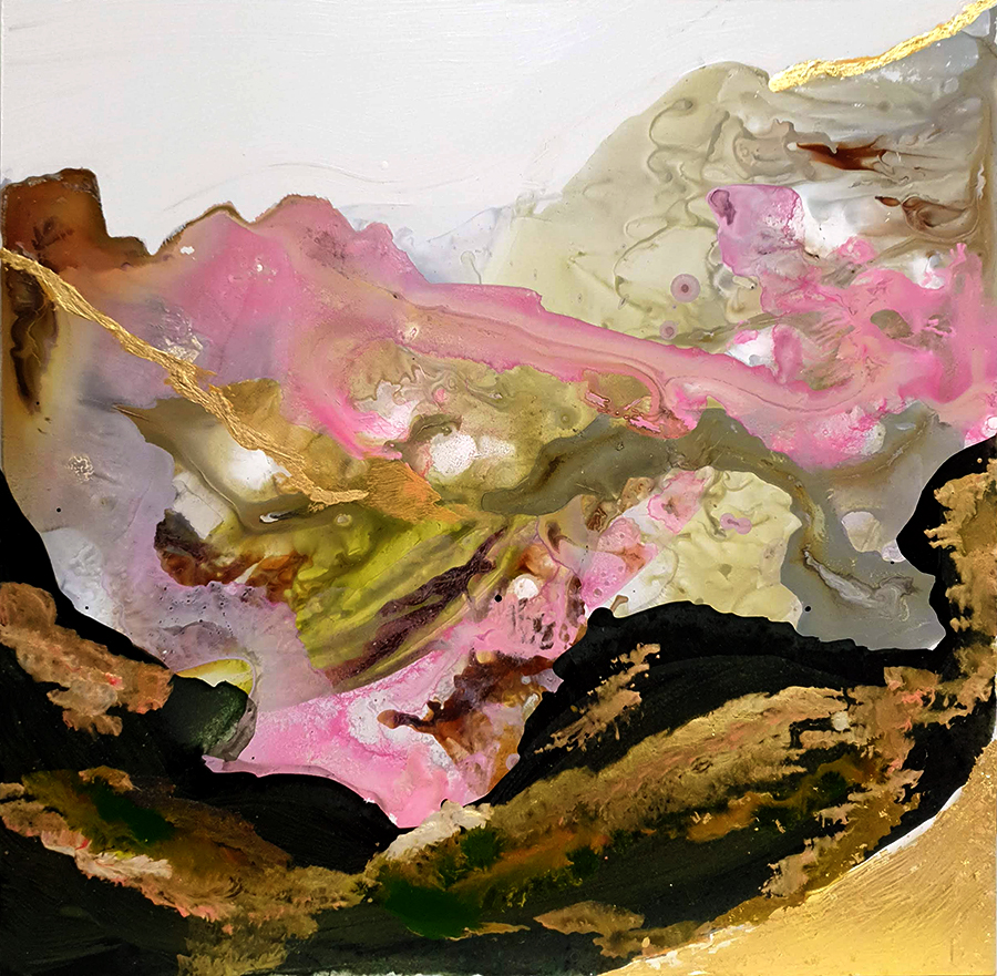 Combining my love of fluid art, gold, inks and expressive brushstrokes have produced a mountainous abstract landscape composition.