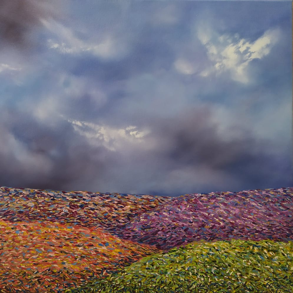 After visiting an amazing exhibition “Lyrical Landscapes” by William Robinson, I was inspired to play with textured colours. The painting is made in oil, with impasto details for texture. The sides are painted black.