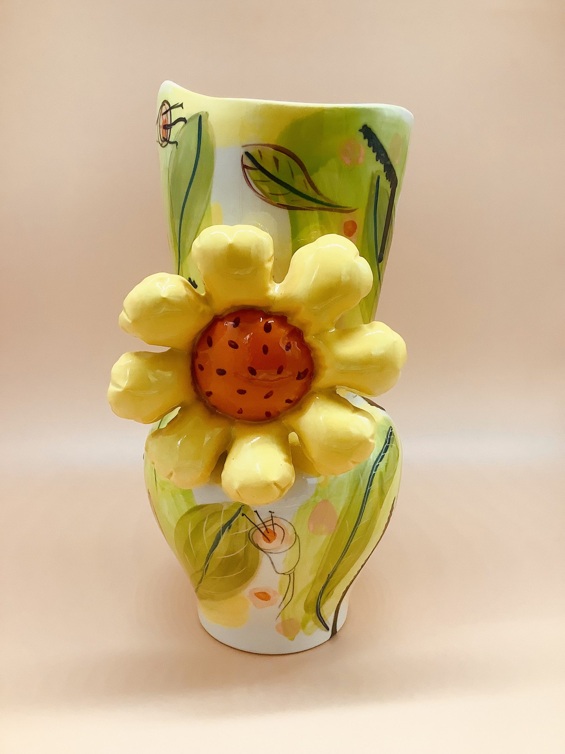 Flower Power Vase is one of an ongoing series of functional vases with a contemporary flavour, made by Stephen Baxter. The vase is hand made from pure white mid-fired porcelain clay, embellished with underglazes, copper oxide and clear glaze. The vase has a glass inner sleeve that slides out of the porcelain vase, protecting the vase from accidents, making for safe and easy cleaning. There is a cork disk element that sits under the glass sleeve for protection as well.