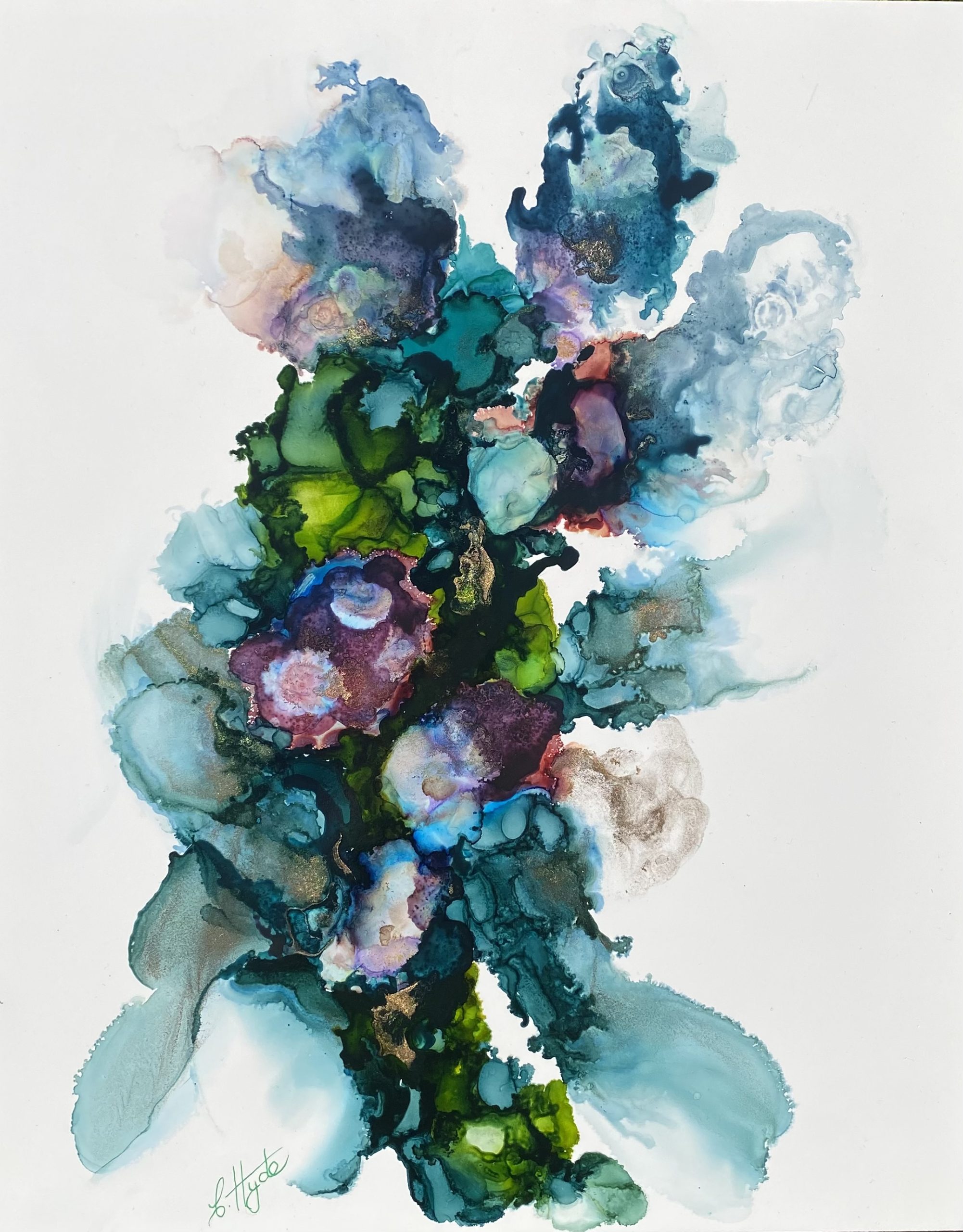 Flower Wall by Christine Hyde – Abstract Art is one of a pair (see other art work titled ‘Bouquet – abstract art’ which can be purchased singly or as a pair. Flower wall is a semi-abstracted impressionist painting in mixed media (inks) depicting a group of flowers in a spray composition. The colours are blues, violets, green and sprinkled with gold highlight paint.