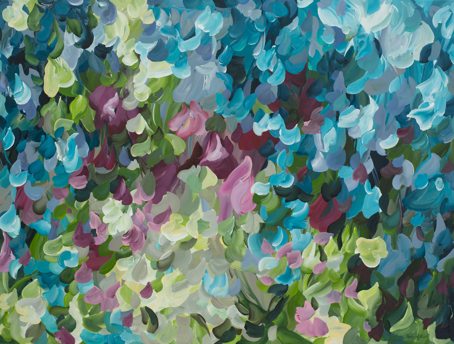 Flowering Garden – 120x90cm Colourful floral abstract by botanical artist Amber Gittins.