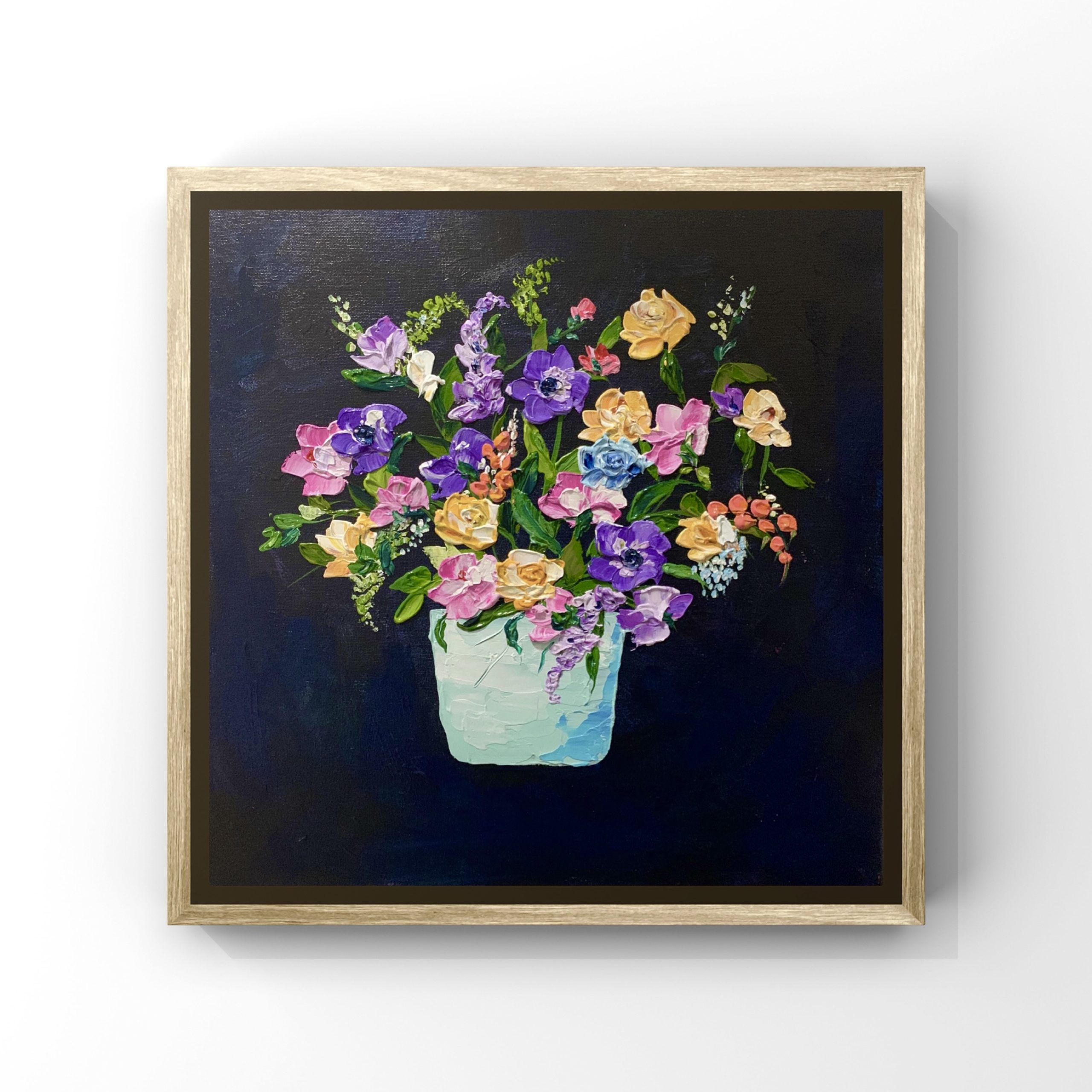 Artist has used impasto technique to create unique dimensional, tactile work. The thick layers of paint used to paint the fore flowers almost make them appear popping out of the painting.
