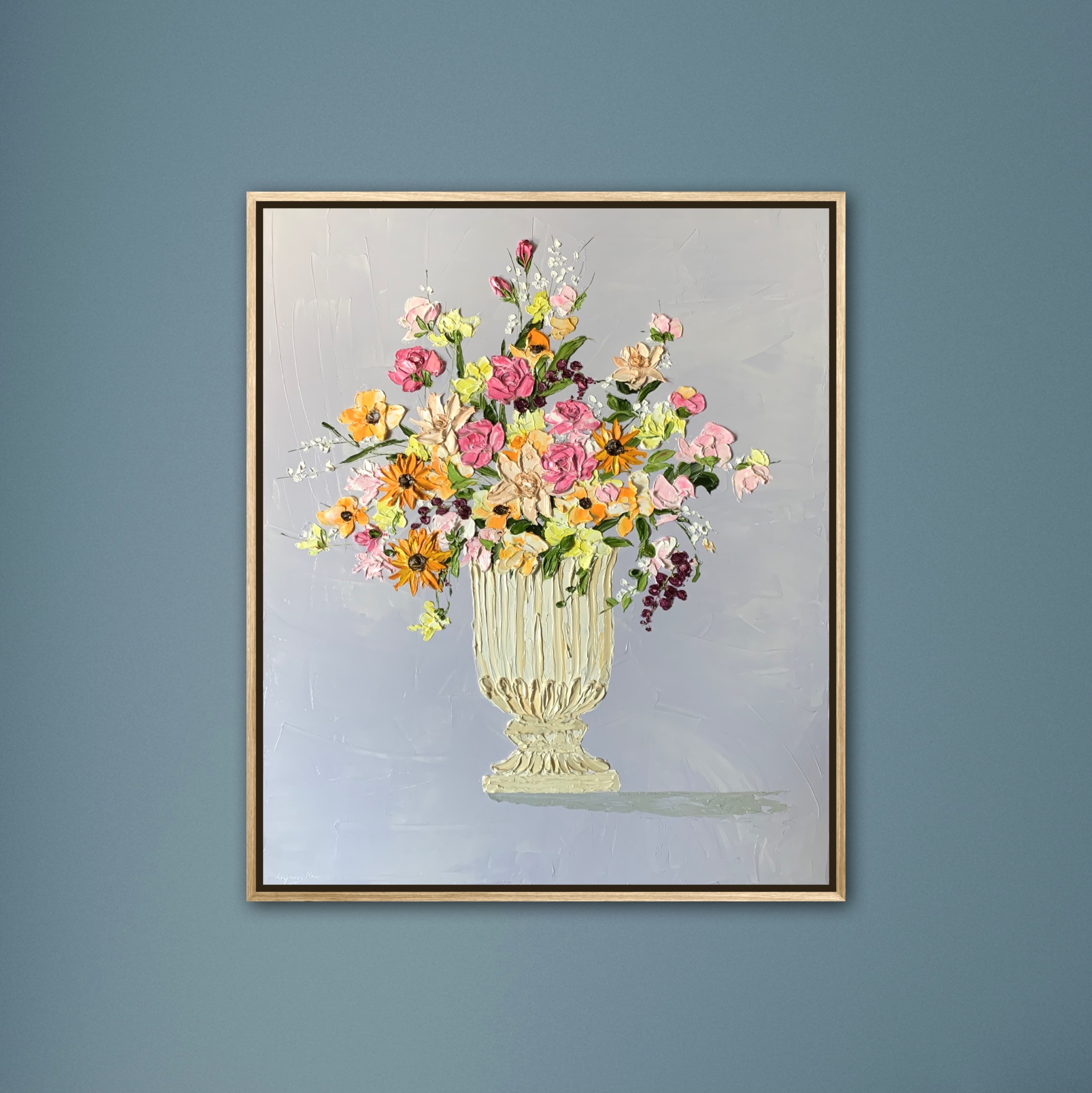 This heavy textured artwork is made using impasto technique with palette knife and is framed in oak timber floater frame, ready to hang.