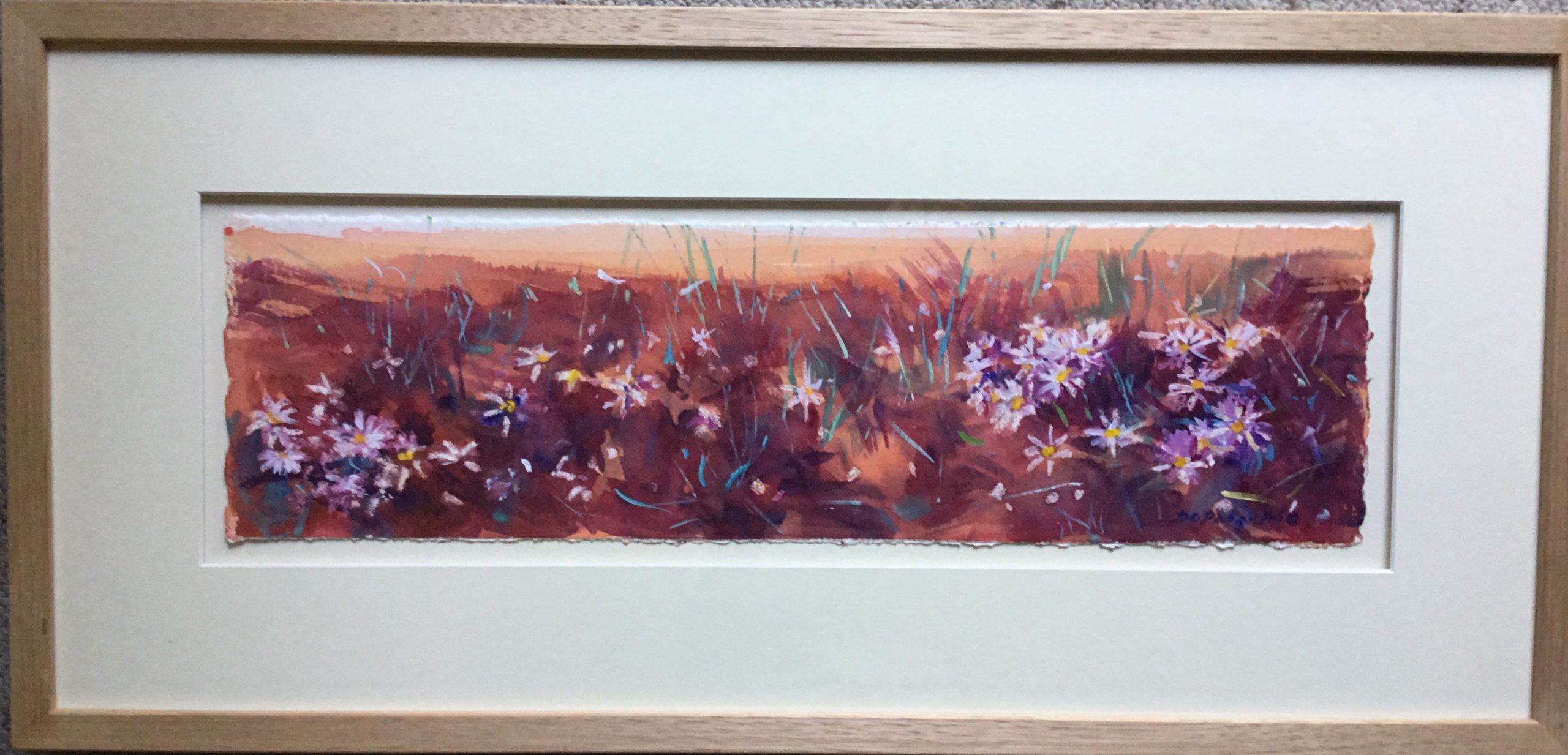 ”Flowers of the Desert“ by Faye De Pasquale – Is a sensitively executed, watercolour and mix on top quality watercolour paper framed with a beautiful contemporary timber gentle natural toned Molding.