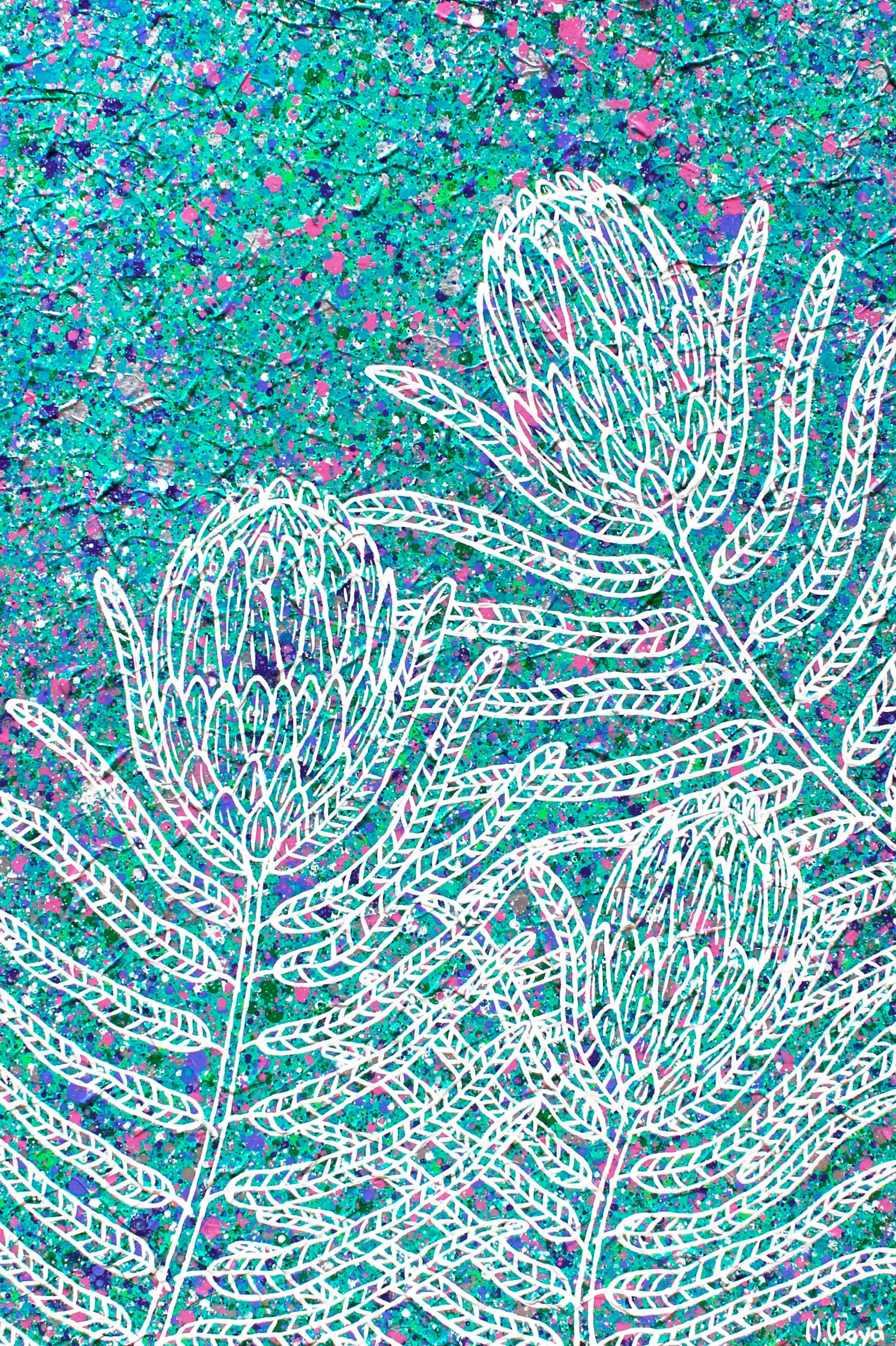 Flowers – Proteas textured abstract by Miranda Lloyd – This is my first outline Protea Flowers painting inspired by living in the Adelaide Hills as many locals sell bunches of these beautiful flowers and my favourite variety is the King Protea. This painting is also is inspired by lino printing also going back to my roots when I first started painting using more line art style, I did a lot of palms and bamboo back then.The background is a mix of blues, greeny blues, pinks, purple, silver and white.