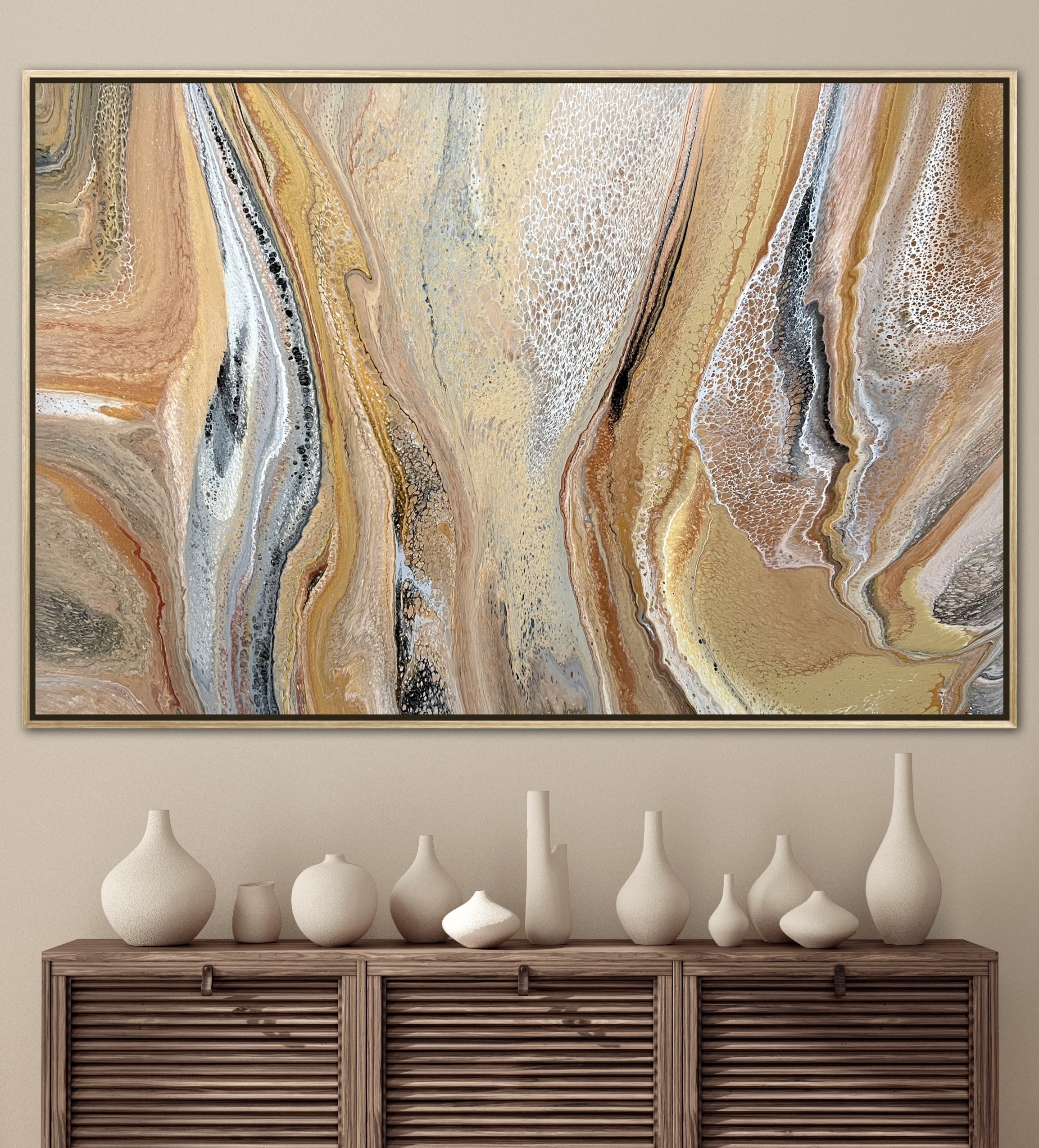 Flowing Sand and Stone was created using various techniques combined to allow increased flow, interaction and separation of colours to create interesting patterns where pops of colour can be seen emerging from underneath. This added dimension adds lace and cells to the artwork creating an interesting and one of a kind painting that can never be replicated. A gorgeous variety acrylic pigments were used including metallic yellow and warm gold, cream, bronze, copper, silver, grey, black, rose gold and white.