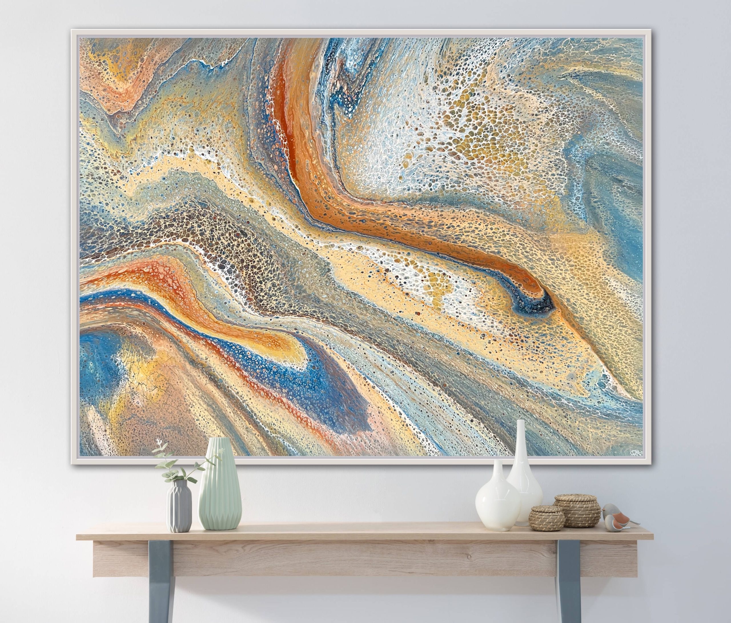 Flowing through Sand – original artwork by Angela Roskell – a unique, eye-catching multi-directional large abstract acrylic painting stretched and ready to hang.