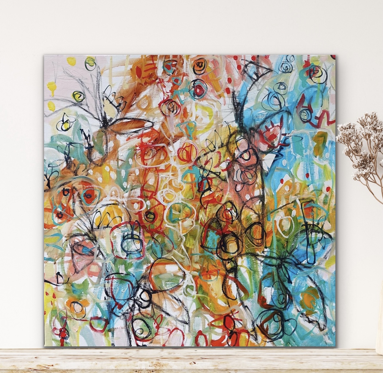 This work is oil and acrylic on 61X61 cm Fine Belgian Linen, signed on the front and sent with an artist cv and certificate of authenticity.