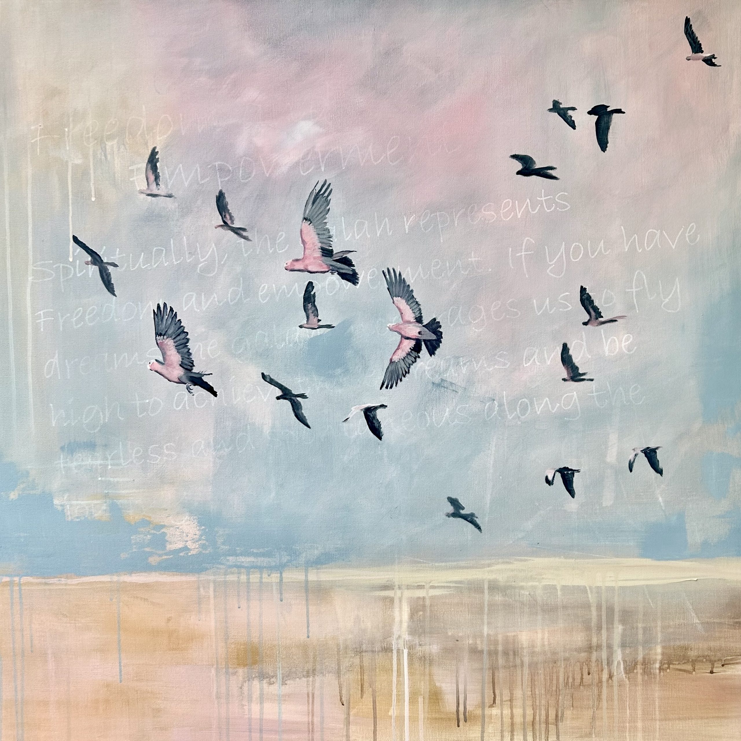 Soft pastels are an aesthetic that is nothing new in interior design. Calm hues were popular as far back as the 18th century, used with abundance in decorative Rococo interiors. Rococo style is sometimes referred to as ‘Late Baroque’ and has always been famous for being in tune with the feminine and the light. This is certainly a modern and rustic take on a beautiful feminine light. Further to the colour and mood of this painting you will find the pink galah symbolises spirituality, freedom and empowerment. If you have dreams, the galah encourages us to fly high to achieve these dreams, and to be fearless and spontaneous along the journey.