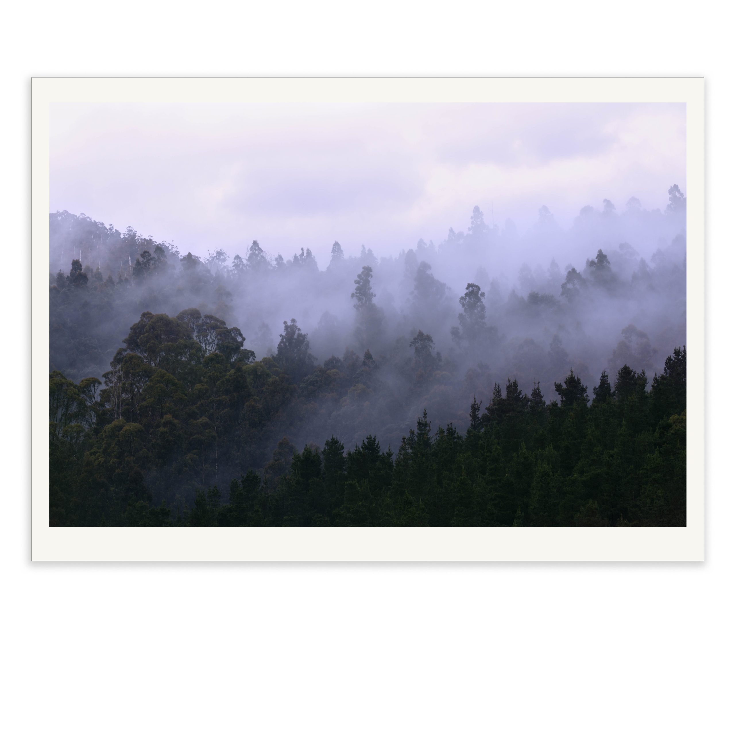 A misty mountain ridge draped in soft fog rises above the forests of the Huon Valley in southern Tasmania. Gentle tones of lavender and blue infuse the landscape with an uplifting sense of transcendence. A moment where light, water and air merge. A photograph that captures the essence of the Tasmanian landscape, where poetry collides with nature’s shifting moods.