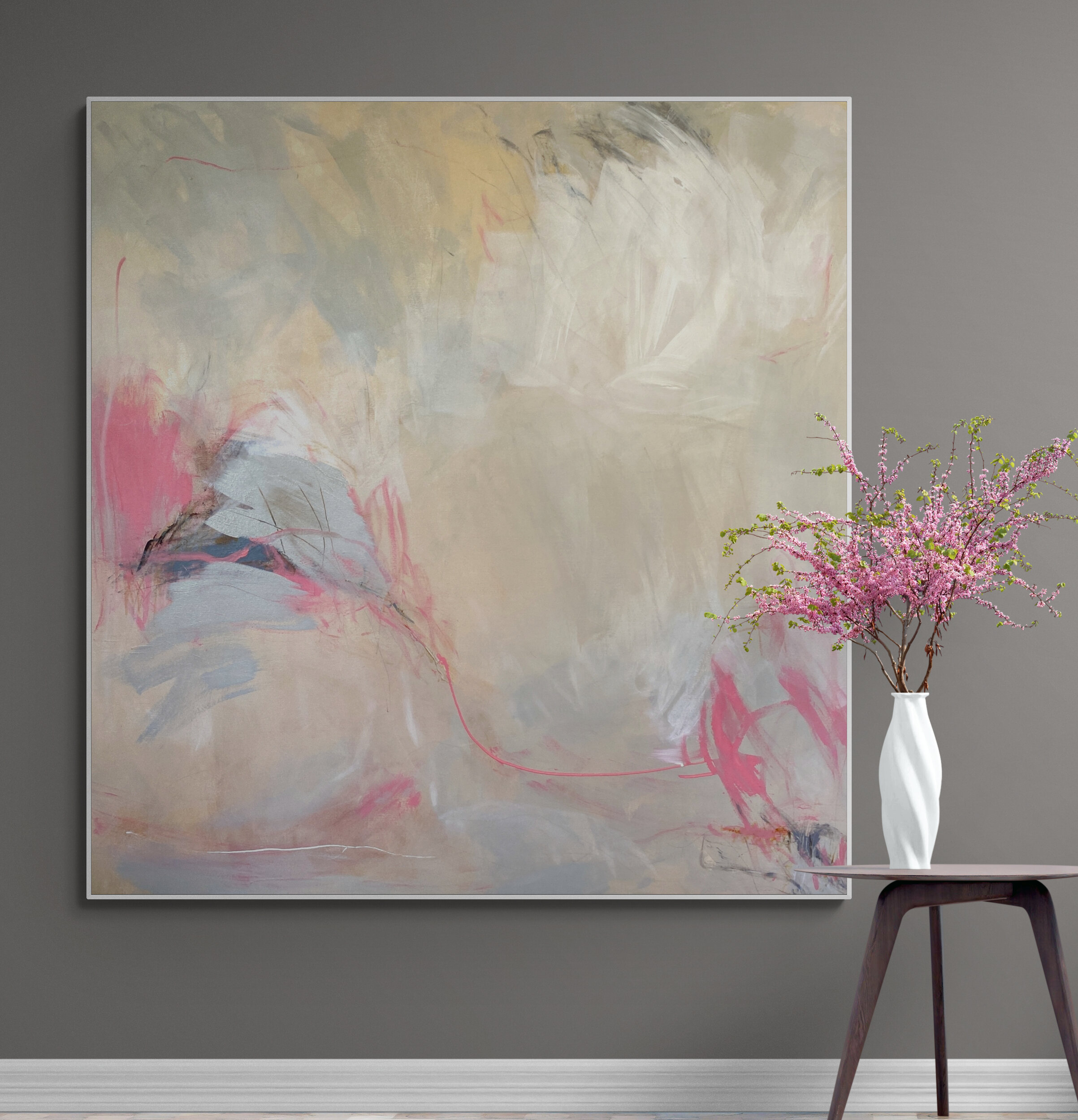 It’s intriguing mark making combined with its restful and calm palette of beautiful soft blush and subtle pinks, ochre, brown, grey, mixed with cool beige and white neutral tones makes this statement piece work so well.