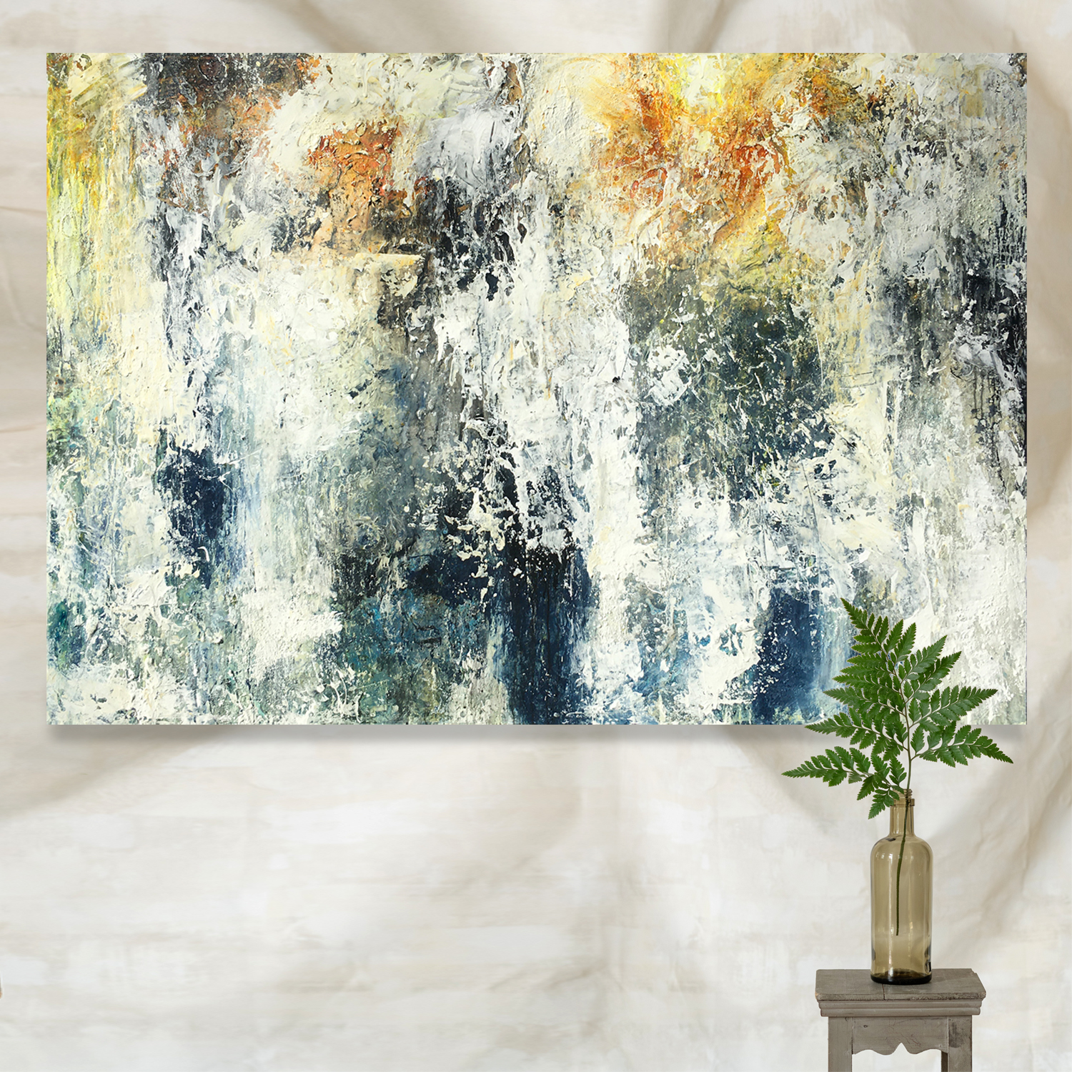 Follow Your Heart by Lynne Godina-Orme – A very large, muted abstract with deep splashes of yellow and orange. Taking a long time to finish and build up each layer has given this piece so much texture and depth.