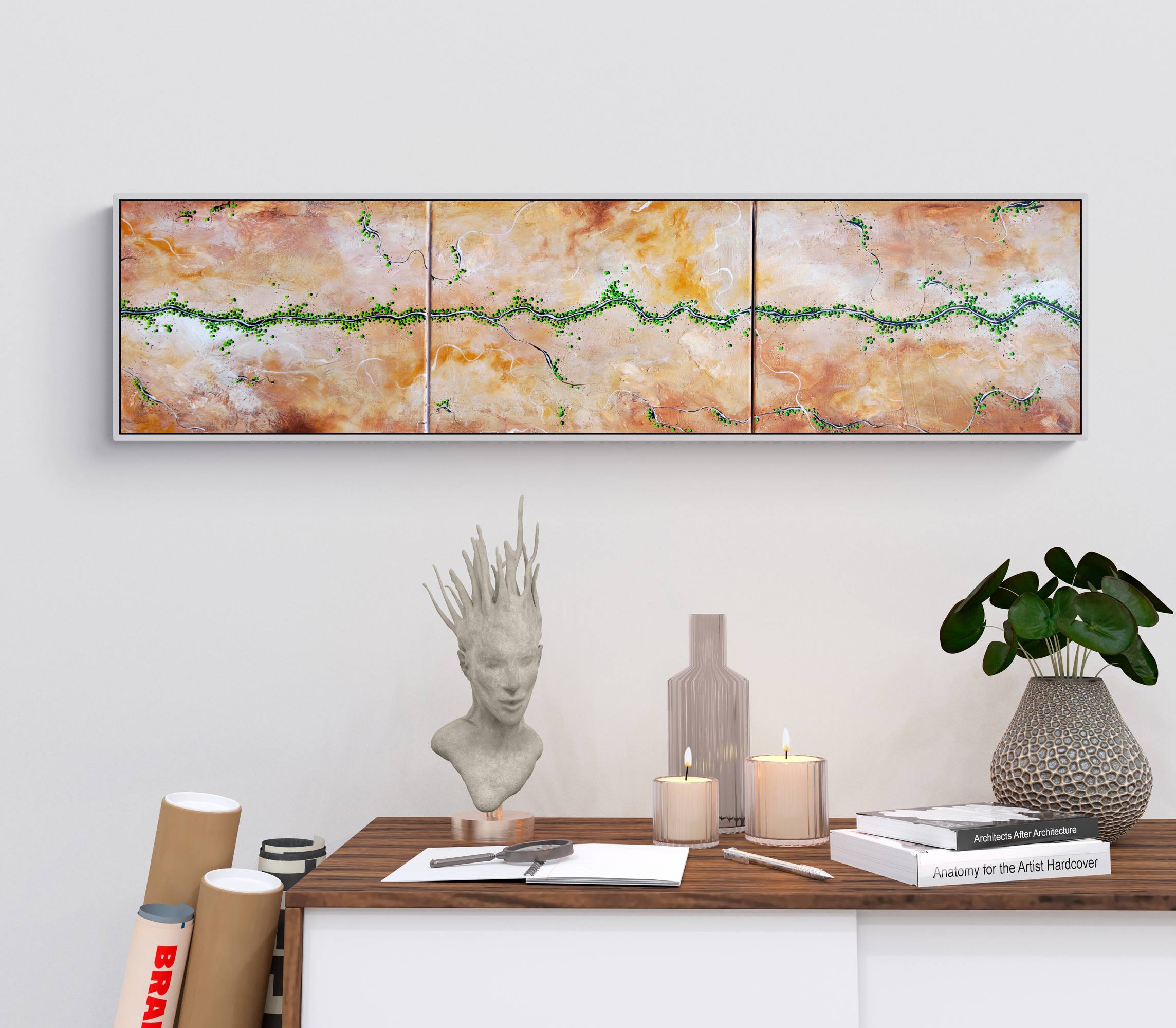 Following The River Of Hope by Tania Chanter is an aerial abstract landscape inspired by the rich and vibrant tones of the Australian outback and the changes of light and mood throughout the day. Tania’s hope is that this painting brings a sense of calm to the room where it lives, and that is makes the people who enter the room feel as though a part of nature is right there with them.
