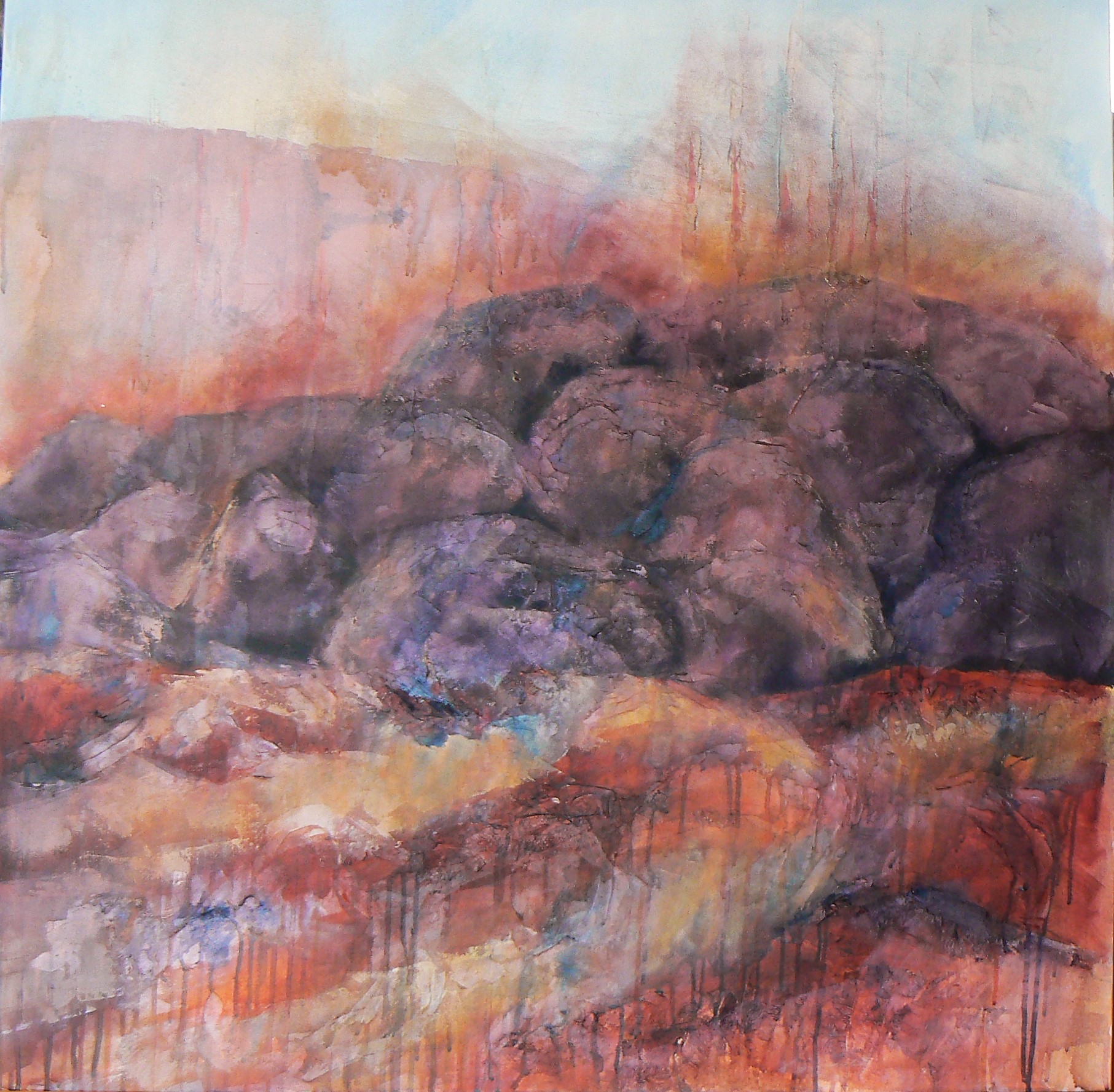 This painting is abstracted from photos I took years before when travelling through the Victorian Alp area during summer. Years later these photos have been an inspiration for landscape paintings. The colours, textures and wispy distant mountains, forests and sky gives takes you on a journey into the hill country.