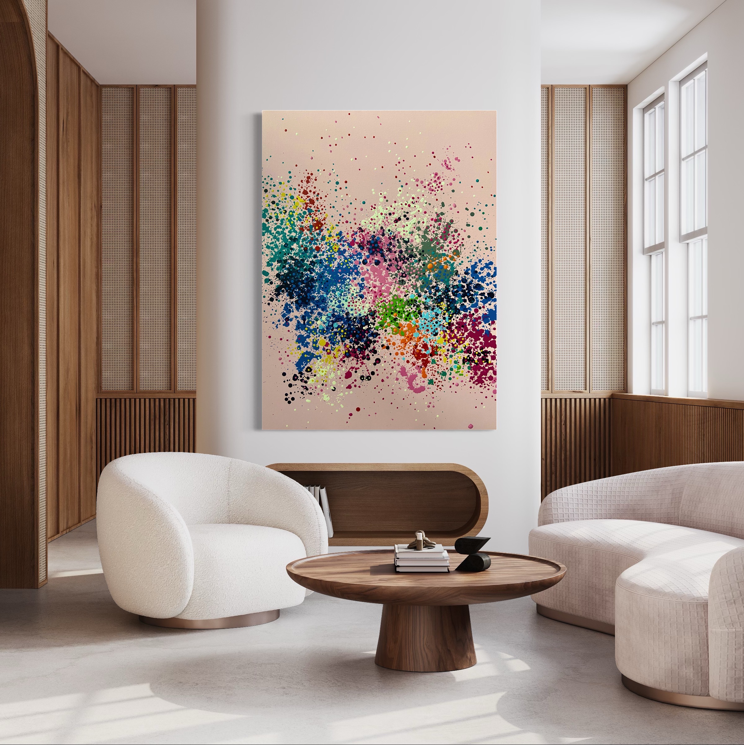 An abstract impressionist approach, a new painting that is carefully arranged by showcasing organic shapes and speckles with fragments of contrasting colours.