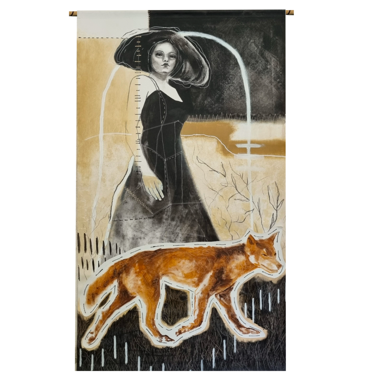 The single female figure stares out of the painting, looking as if she wants to engage in a conversation with us and tell us her story. Her only friend in this work is the dingo that walks with her.