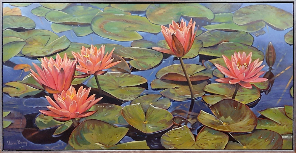 Hi everyone, the inspiration for this artwork comes from the Blue Lotus Garden, Victoria. This painting depicts a serene pond filled with vibrant water lilies in full bloom. The flowers, in rich shades of pink and orange, rise gracefully from the water on slender stems, surrounded by broad, green lily pads. The calm water reflects the sky and surrounding foliage, adding depth and tranquility to the scene. The intricate details of the petals, the subtle variations in color, and the interaction of light and shadow create a realistic and harmonious composition. It also captures the peaceful beauty of nature, evoking a sense of calm and admiration for the delicate elegance of water lilies. This piece comes with a certificate of authenticity, varnished in satin finish and with a matching frame in Tasmanian oak for your wall. Hope you enjoy xxx