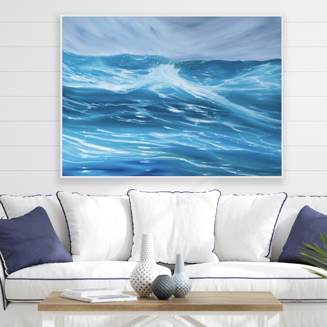 ‘Even big waves start as little ripples’. This large oil painting has the illusion of movement on a high sea with the vantage point of being within it, seeing the beauty in what others find intimidating or frightful.