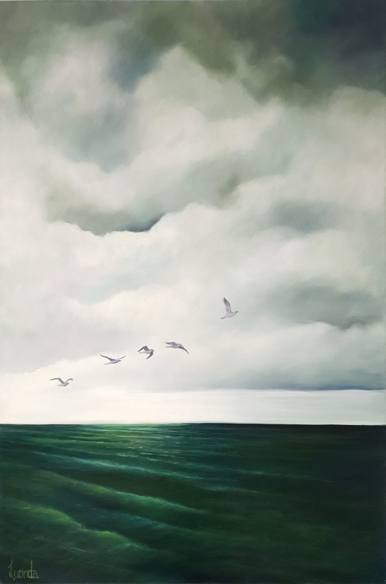 This piece is a return to the deep, dark green ocean and the freedom of the birds on wing as they soar towards home before the sun sets – a solitary flight for each.