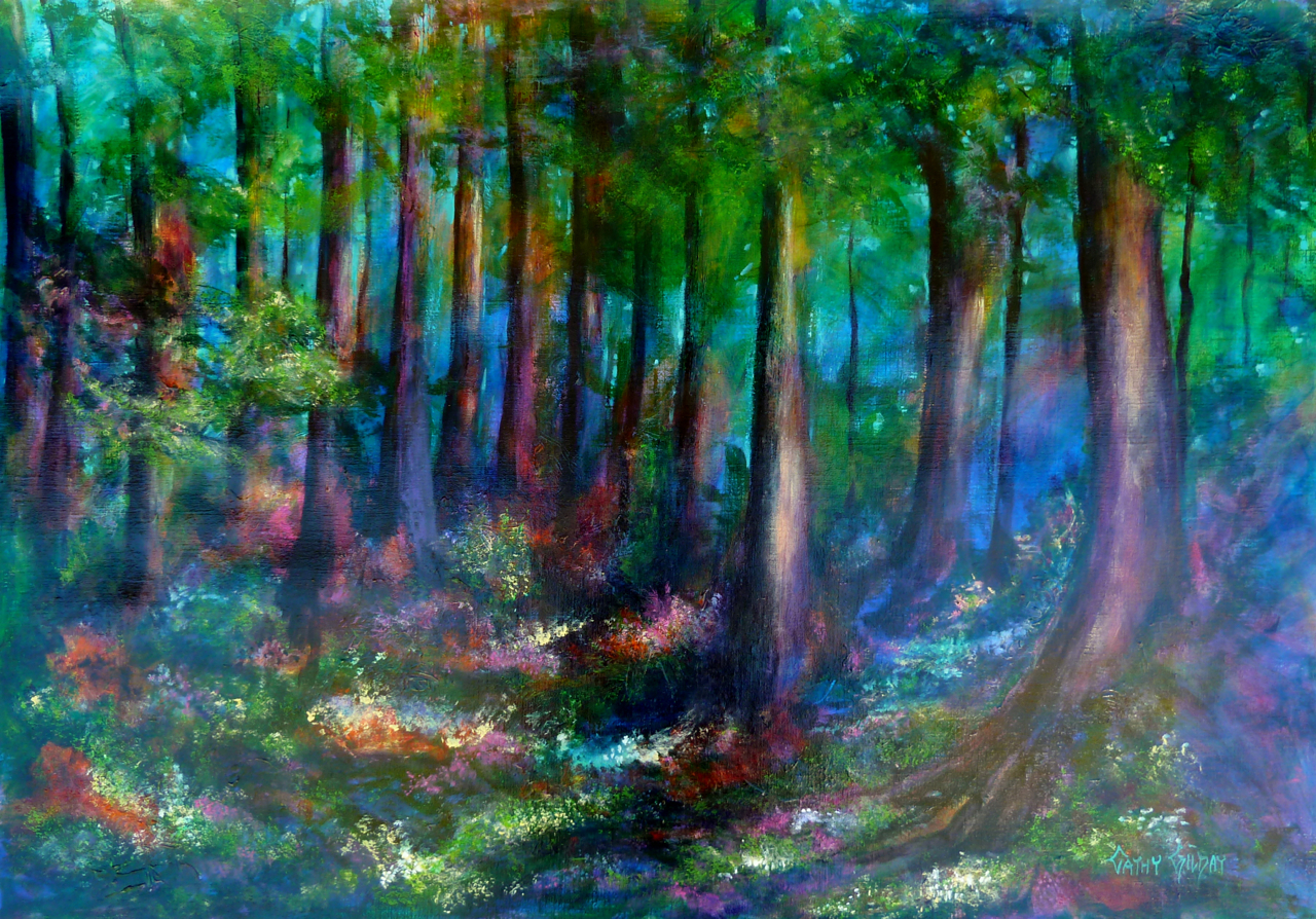 Forest Escape by Cathy Gilday – This artwork was inspired by my love for painting trees and nature. It is an impressionistic painting of a forest, set on a colourful floral carpet. It has a muted, blue backlight, which creates a magical ambience. It looks as though a soft mist is starting to creep through the trees. I have used layers and layers of transparent coloured glazes to achieve a lovely rainbow effect. Beautifully framed in a flat black frame with a wide double mounting mat. ( see images) The entire measurements of framed work are 97.4cm x 72.3cm x 3.8cm.
