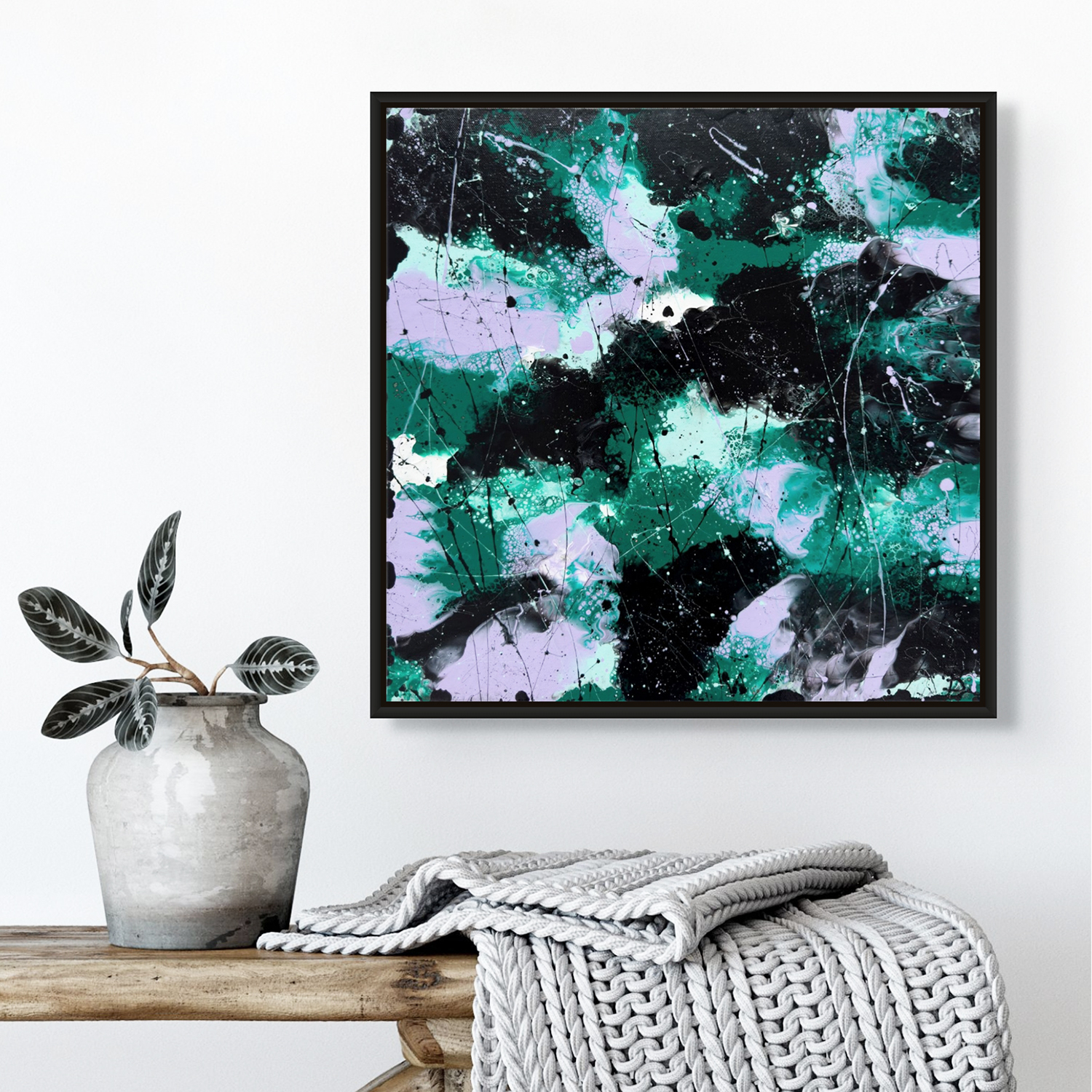 The painting is layered with a mix of paints resulting in a unique and vibrant colour palette of black, white, lavender, dark and light teal hues. Using various techniques I have created organic textures and patterns. Forest I is painted out to the edges of the canvas.