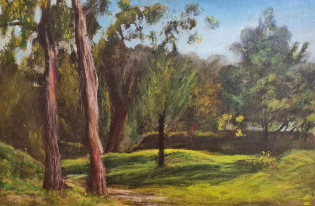 Forest Light by Sam Brett – Forest Light invites the viewer into a quiet grove, where late morning light spills across the grass and through interwoven trees. The work draws inspiration from Camille Corot’s poetic realism and the grounded presence of Constable’s English landscapes. There’s also a subtle echo of Plein Air Impressionism, where nature is observed directly and faithfully, but with a softness that edges toward the romantic. The filtered light and gestural treatment of foliage evoke a sense of timelessness, as though this forest glade were part of a memory or dream. A moment of pause made tangible through brush and pigment.