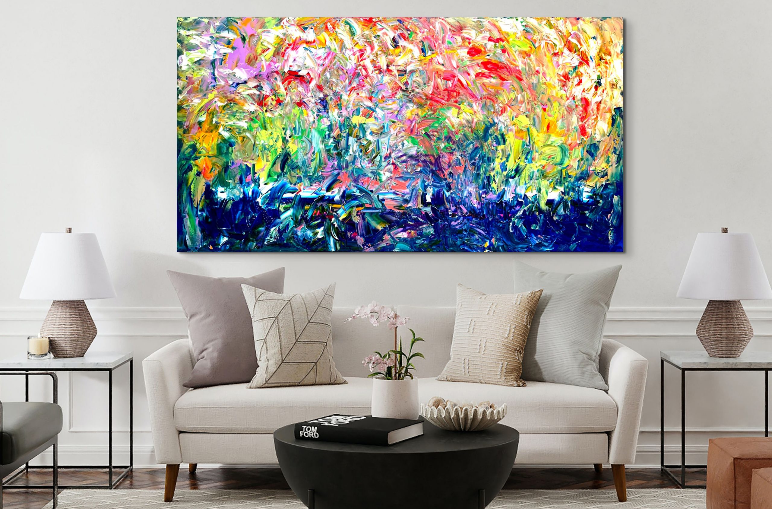 This artwork is painted on professional-grade canvas stretched and sealed with varnish. The canvas has dimensions 213 cm in width by 112 cm in height. The painting is painted dark blue on the sides, the same colour as the blue along the bottom. As such it does not need a frame.