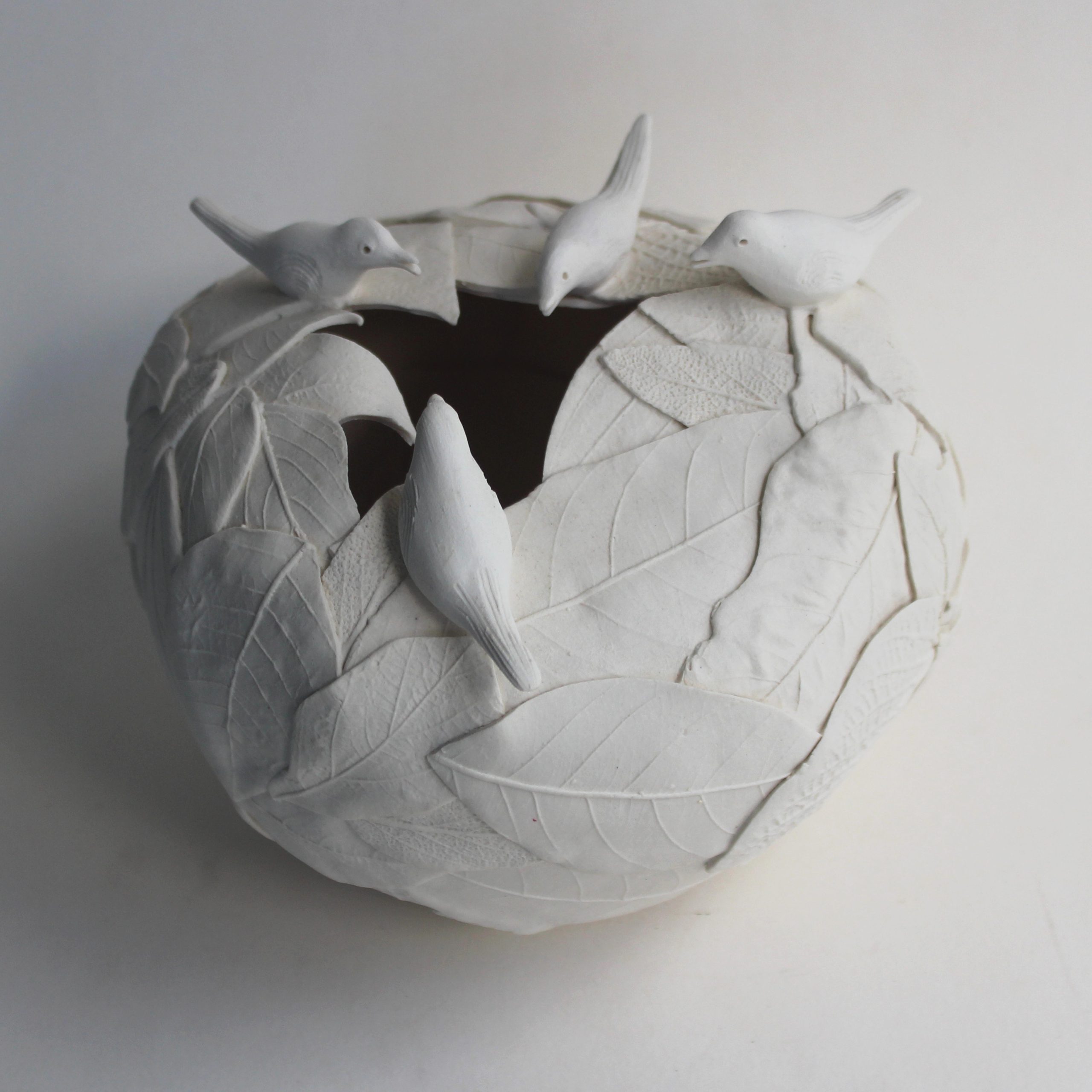 Handmade in fine white porcelain and stoneware clays, this small-scale sculpture reflects my sense of fun.  It also reminds me of my many walks through the forests where I live and the importance of preserving our natural world for future generations to explore and enjoy.  On these forest walks I often tune into the various birds singing away as if they are part of a chorus.  The making process involves the individual assembly of many different moulded leaves to create the form.