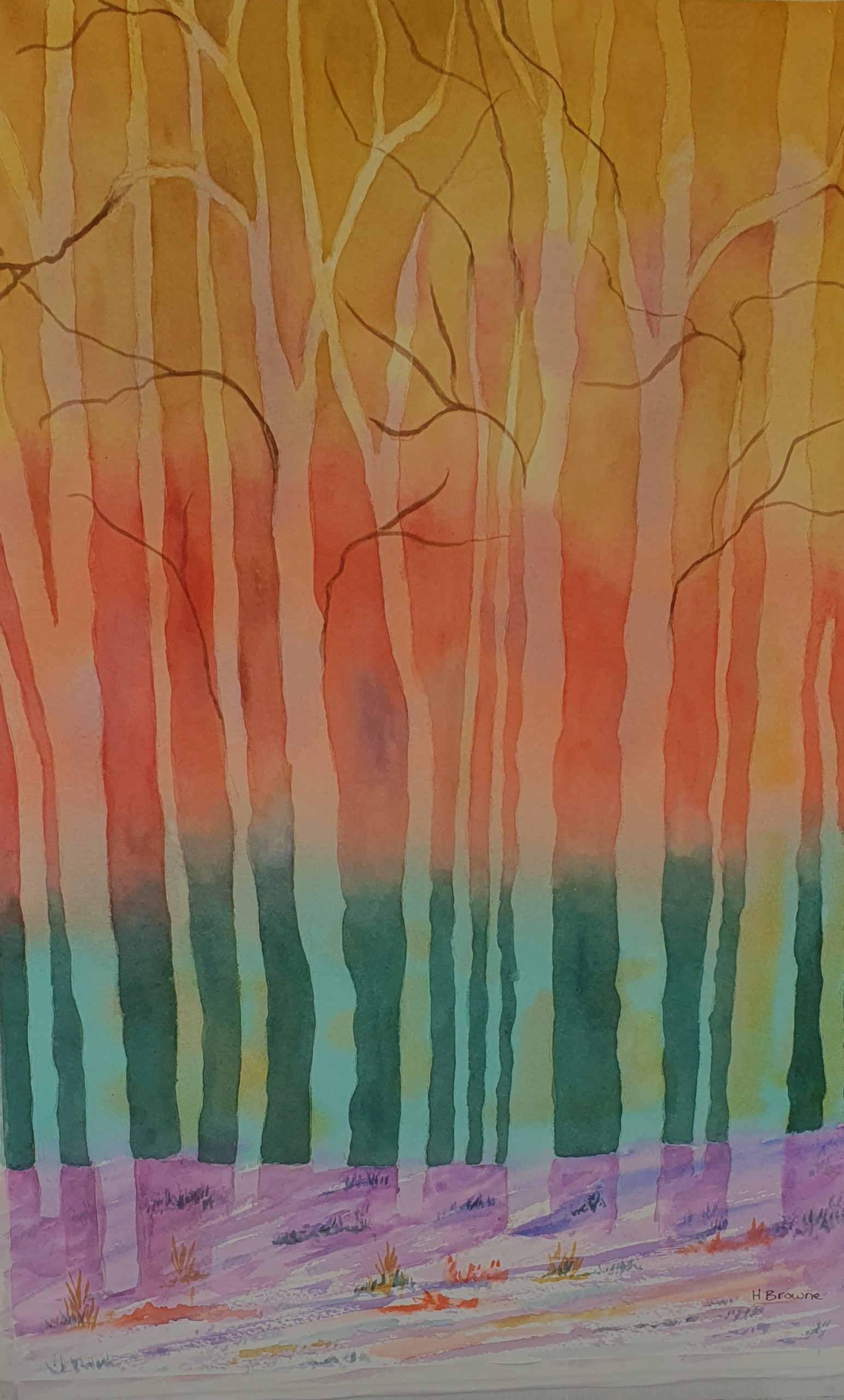 Forest Sunset by Heather Browne is a watercolour painting on Arches 300 gsm cold pressed paper.