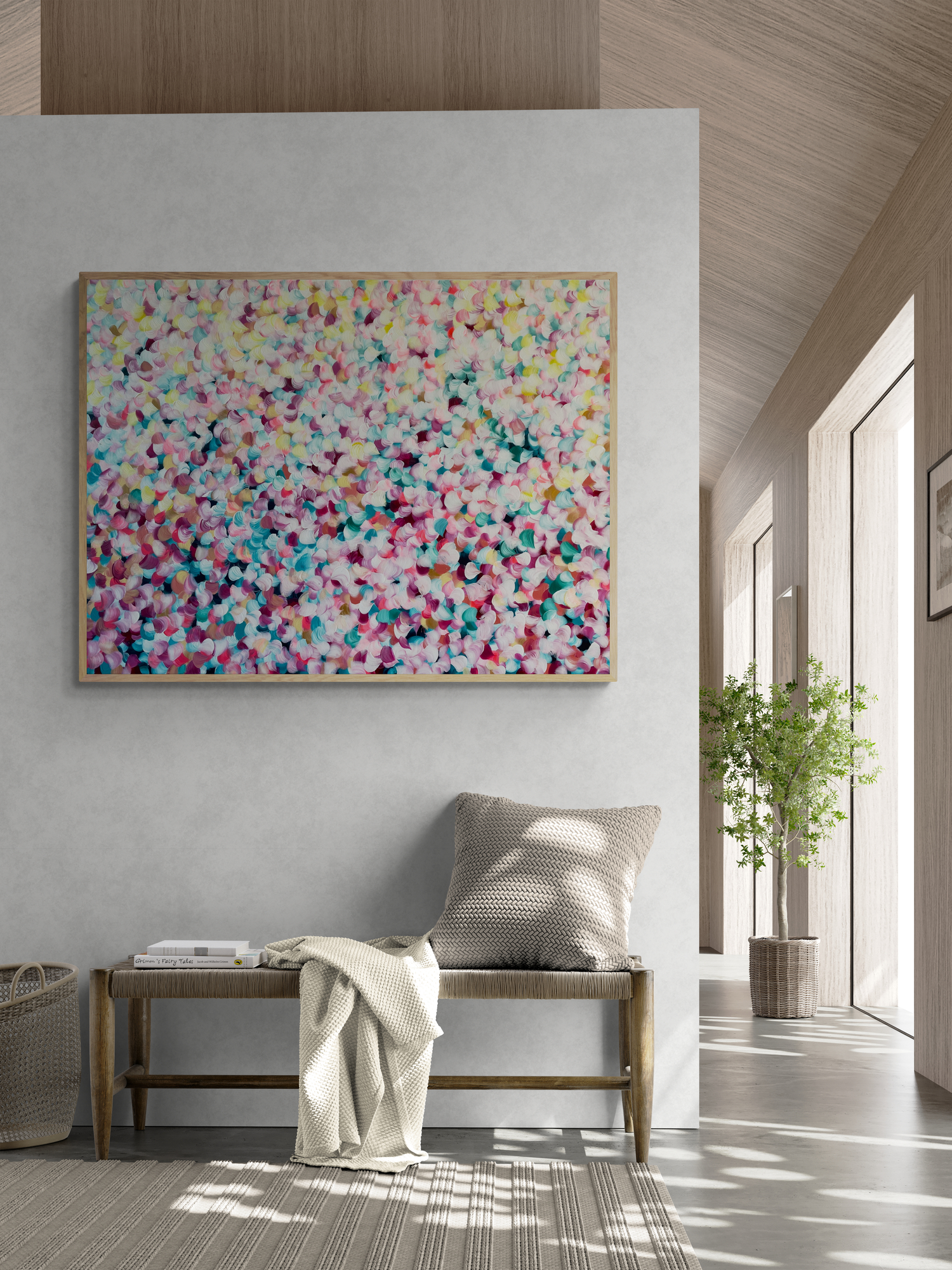 This painting is an abstract expressionist piece characterised by a textured surface of colourful brushstrokes. The strokes are rounded and layered, resembling flower petals scattered across the canvas. The color palette consists of soft pastels such as pink, yellow, and white, along with deeper shades of green, burgundy, and teal, along with splashes of gold. The overall effect is vibrant and dynamic, evoking a sense of movement and depth. The painting conveys an impressionistic, dreamlike quality, reminiscent of a field of flowers.