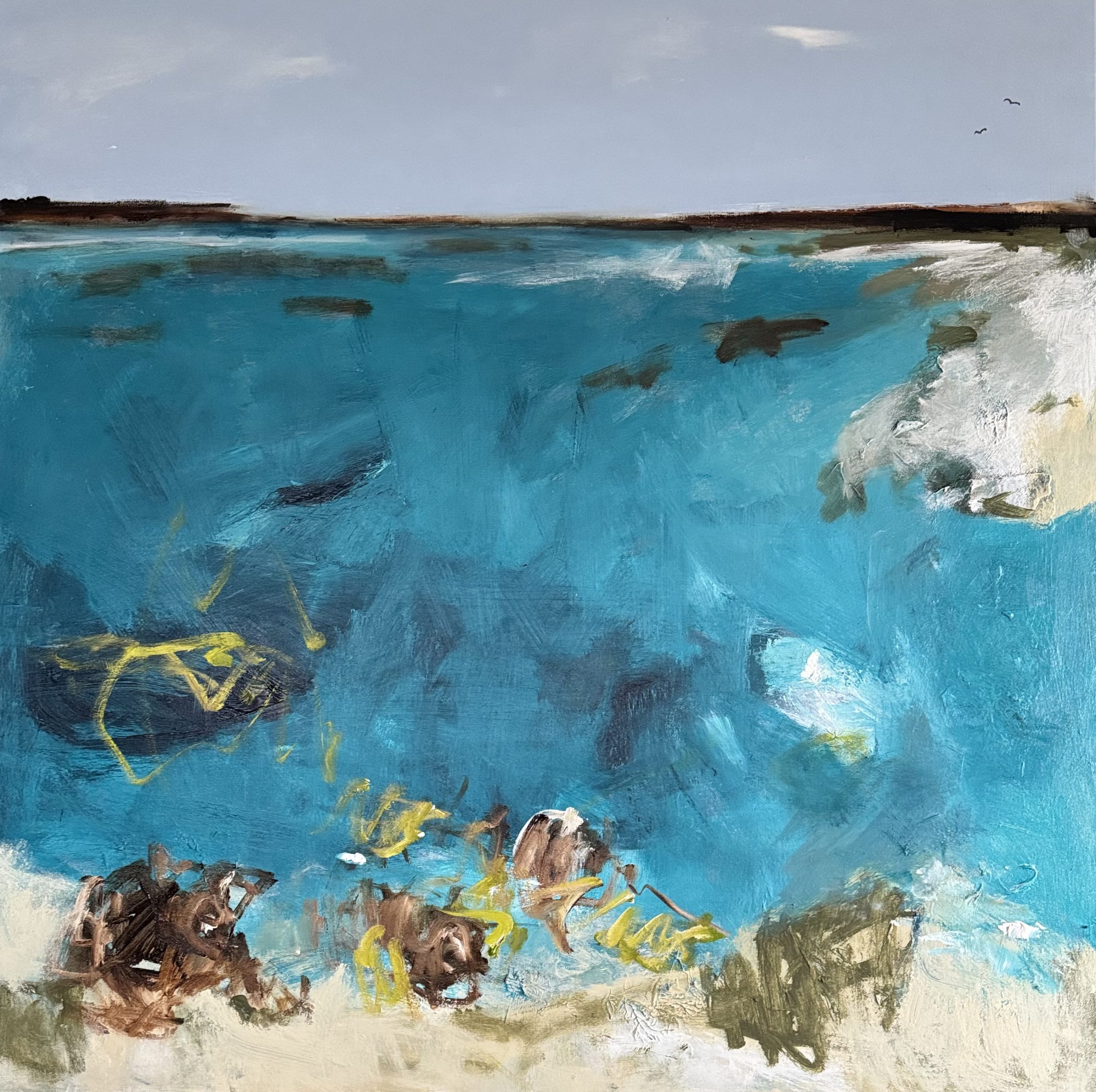 As I layered the paint, I explored what happens beneath the surface — hints of rocks, sea grasses, and shifting sands revealed through earthy browns, sandy creams, and small touches of yellow. These marks are intuitive and expressive, capturing the feeling of water in motion rather than a literal coastal scene. I wanted the painting to feel fluid and alive, much like the ocean itself.