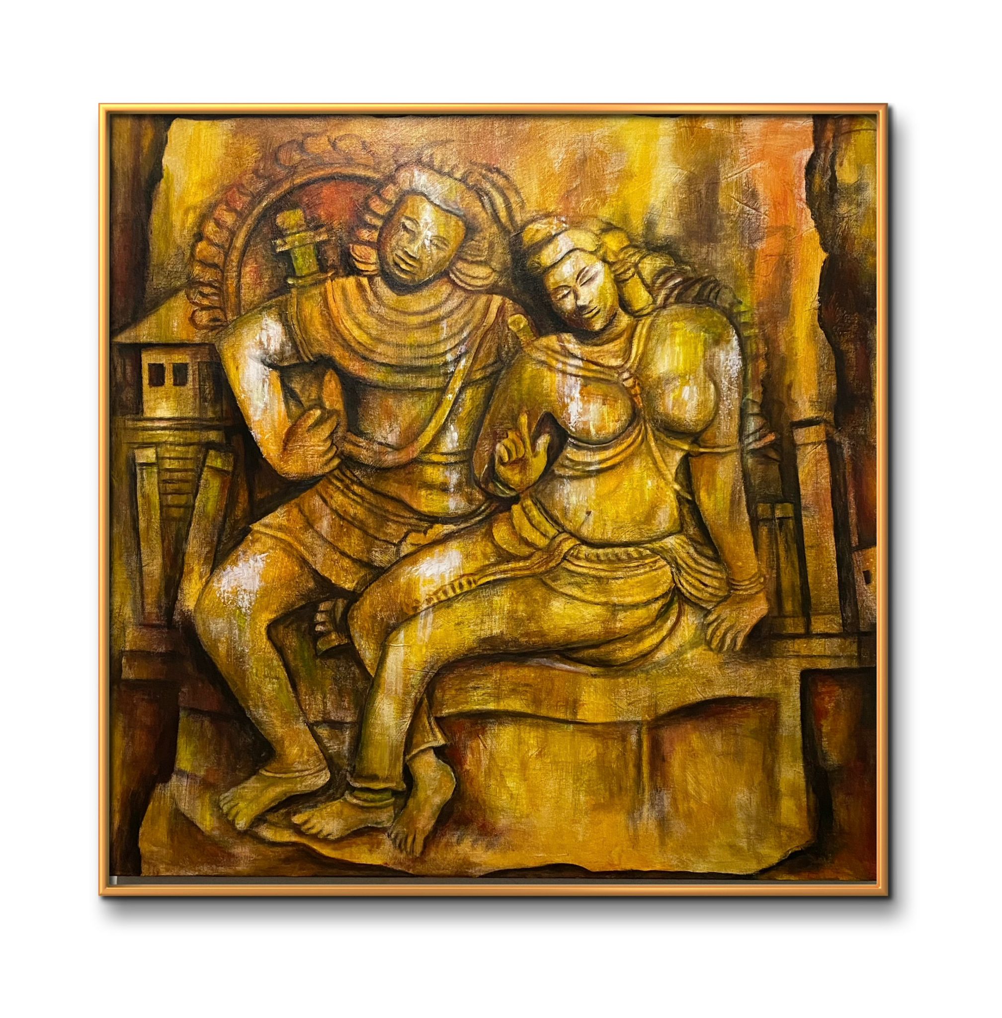 Limited edition of 10 print  “Forever together” by Mahesh Aluthge – From the original contemporary styled painting of The famous rock sculpture in old Ceylon is notable for its artistic detail and the skillful rendering of the figures. The sculptors demonstrated a high level of craftsmanship in capturing the emotions and physical details of the subjects. The identity of the individuals depicted in the painting is not definitively known, contributing to a sense of mystery and intrigue. There are various interpretations and legends associated with the carving.