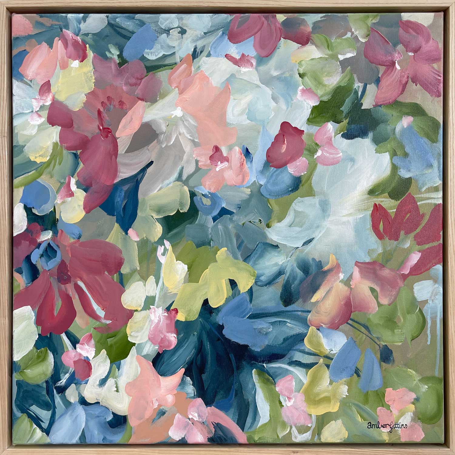Forever Young – Framed by Amber Gittins – Colourful Original Painting – Modern expressive floral abstract painting with a soft and calming colour palette of blues, pinks and greens.
