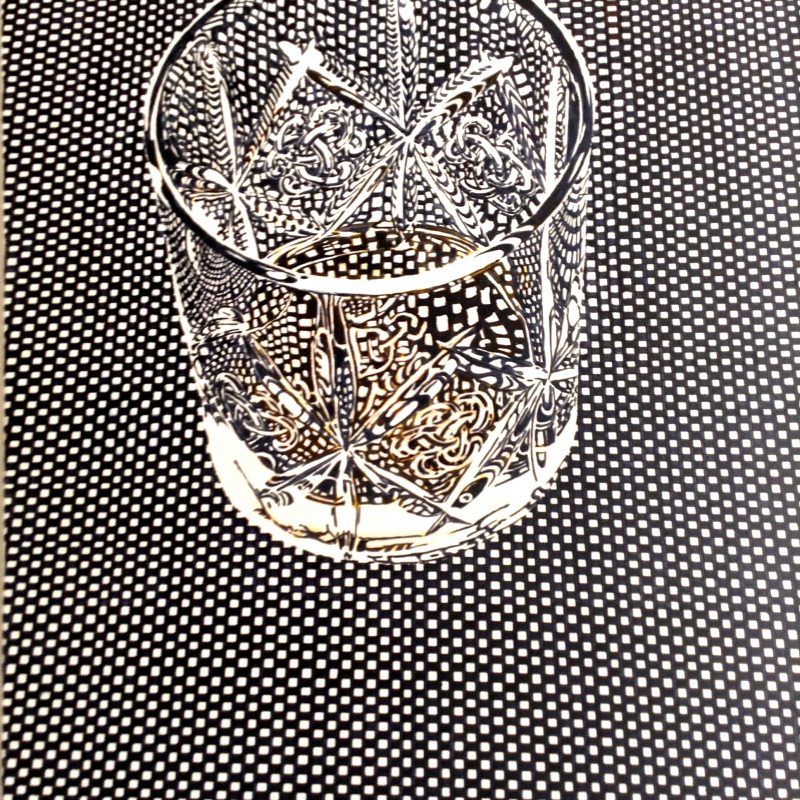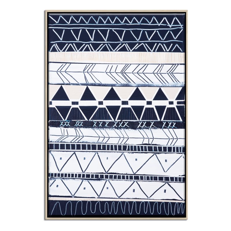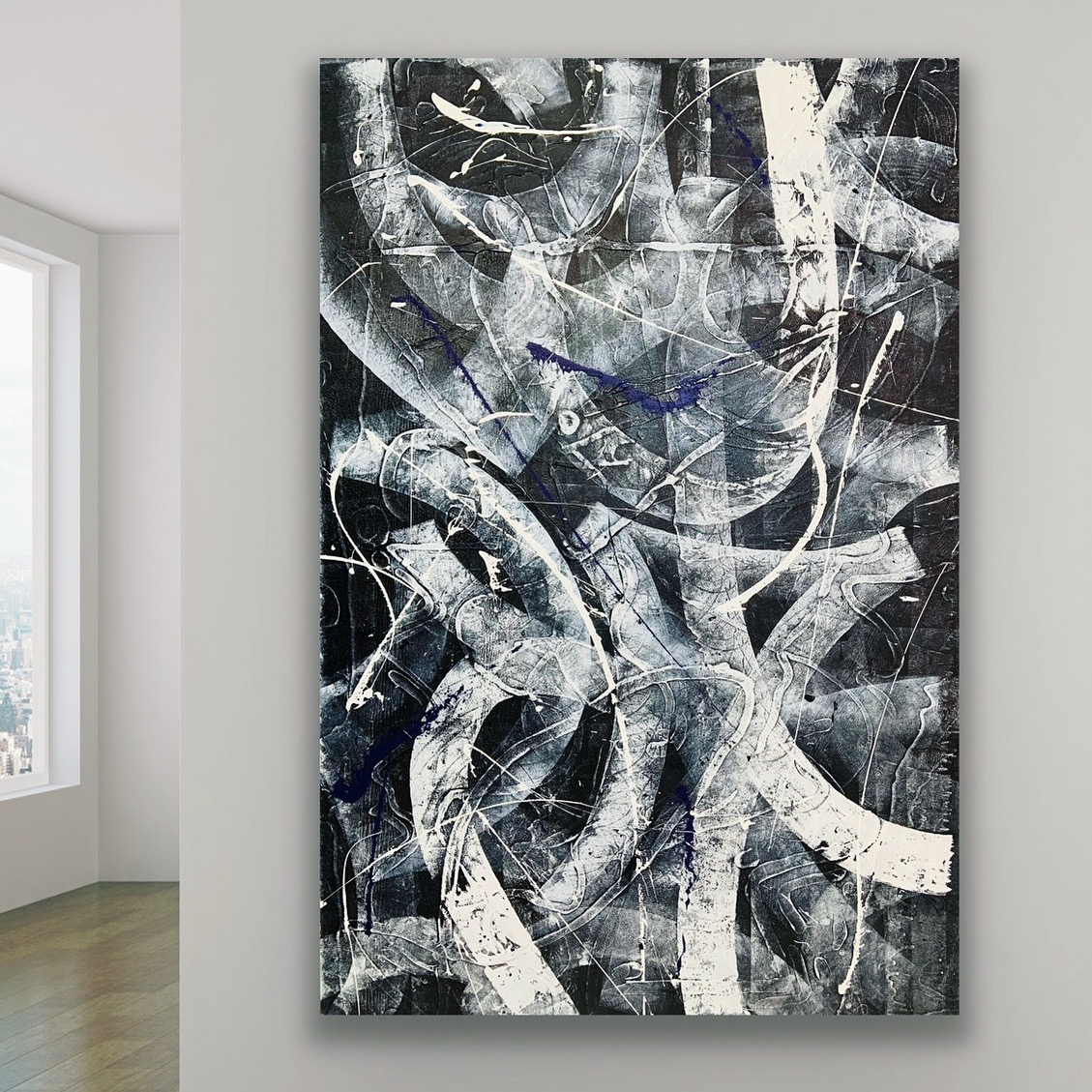 Large black, white and blue abstract painting reminiscent of fossils, the “preserved remains, impression, or trace of any once-living thing.”