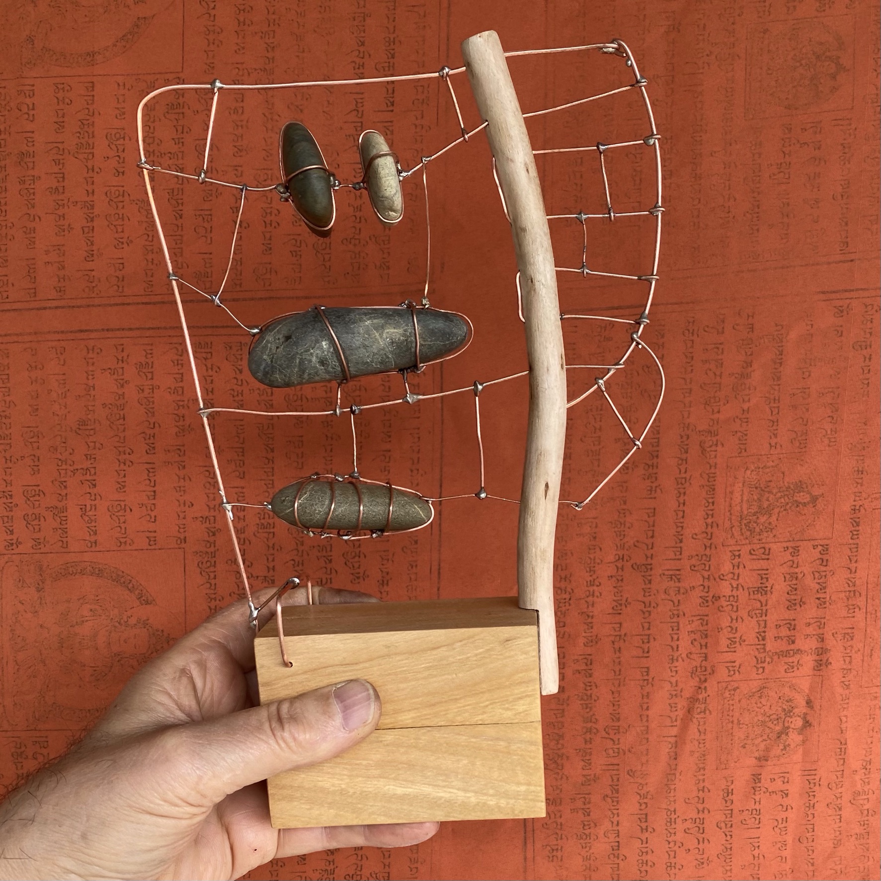A mantra is a numinous sound, a sacred utterance. Mantras don’t have the narrative of prayers. They do not need to be attached to religious beliefs. Not do they project specific ideas. They are simply sound vibrations that potentially provide an opening towards peace and tranquillity. The simple, natural materials of this sculpture reflect the simplicity of the mantra. The work may inspire an observer to create a secret personal sound relating to material or shape. Your mantra stimulates and opens up some peaceful mind space when casually observing the sculpture during a busy day. Made from copper wire, beach pebbles, twigs and hoop pine base.