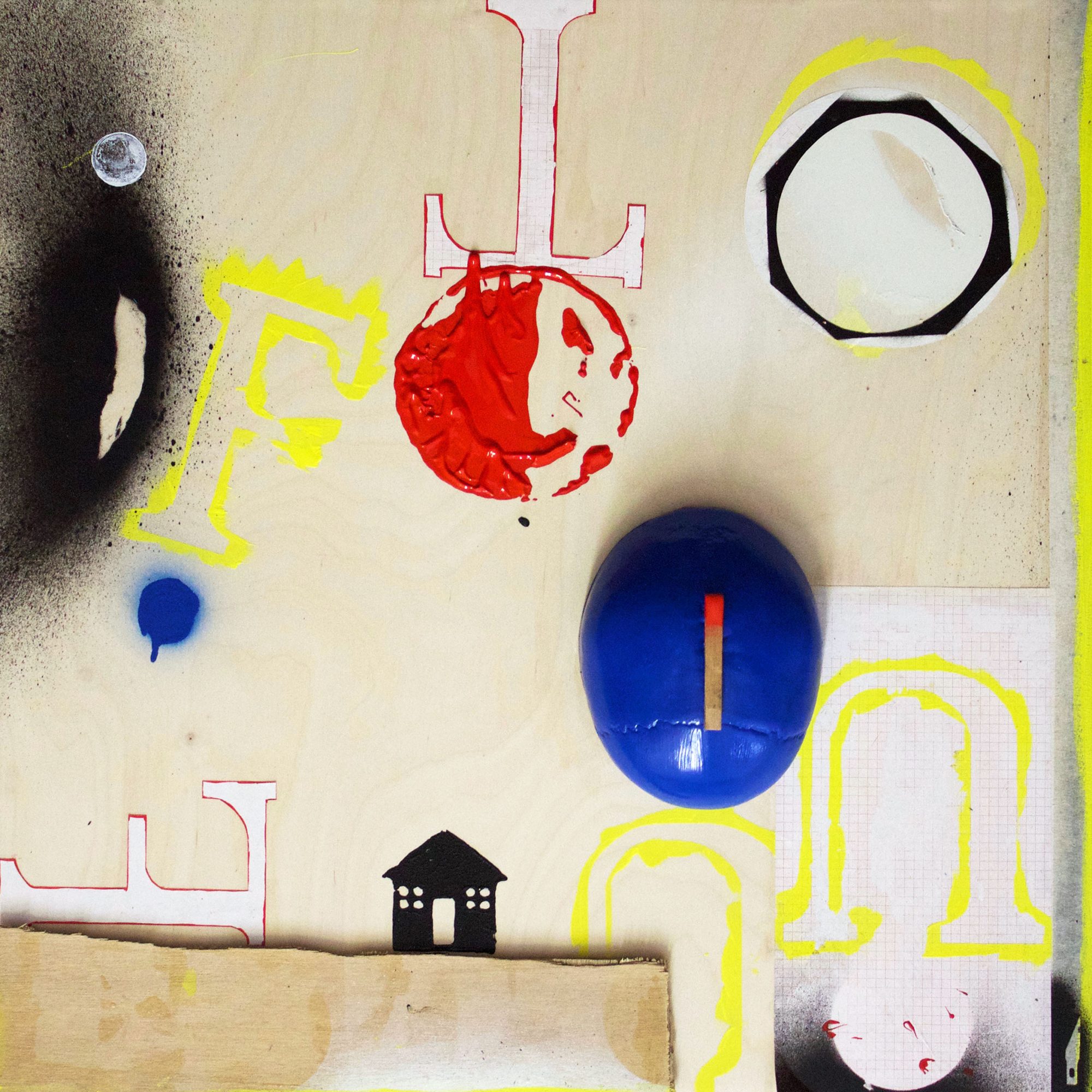 Acrylic, spray enamel, plastic skull top, marine ply and collage on birch board