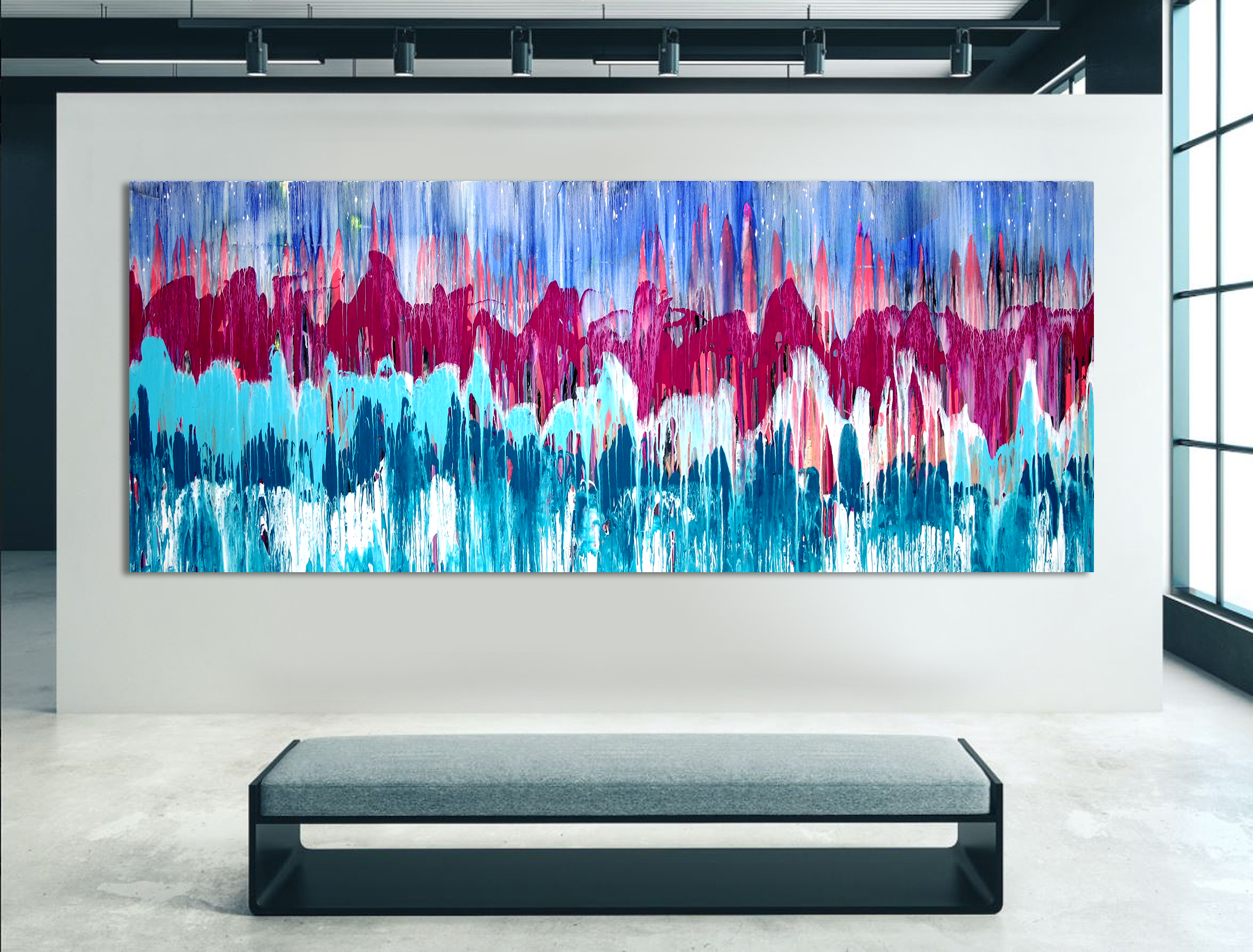This work is painted with synthetic polymer acrylic and the surface is a professional-grade 12 oz canvas and has been sealed with varnish. The canvas is stretched onto an HD stretcher with dimensions 85 cm height by 210 cm in width. The artwork has been painted in the same style on the sides and so does not need framing.