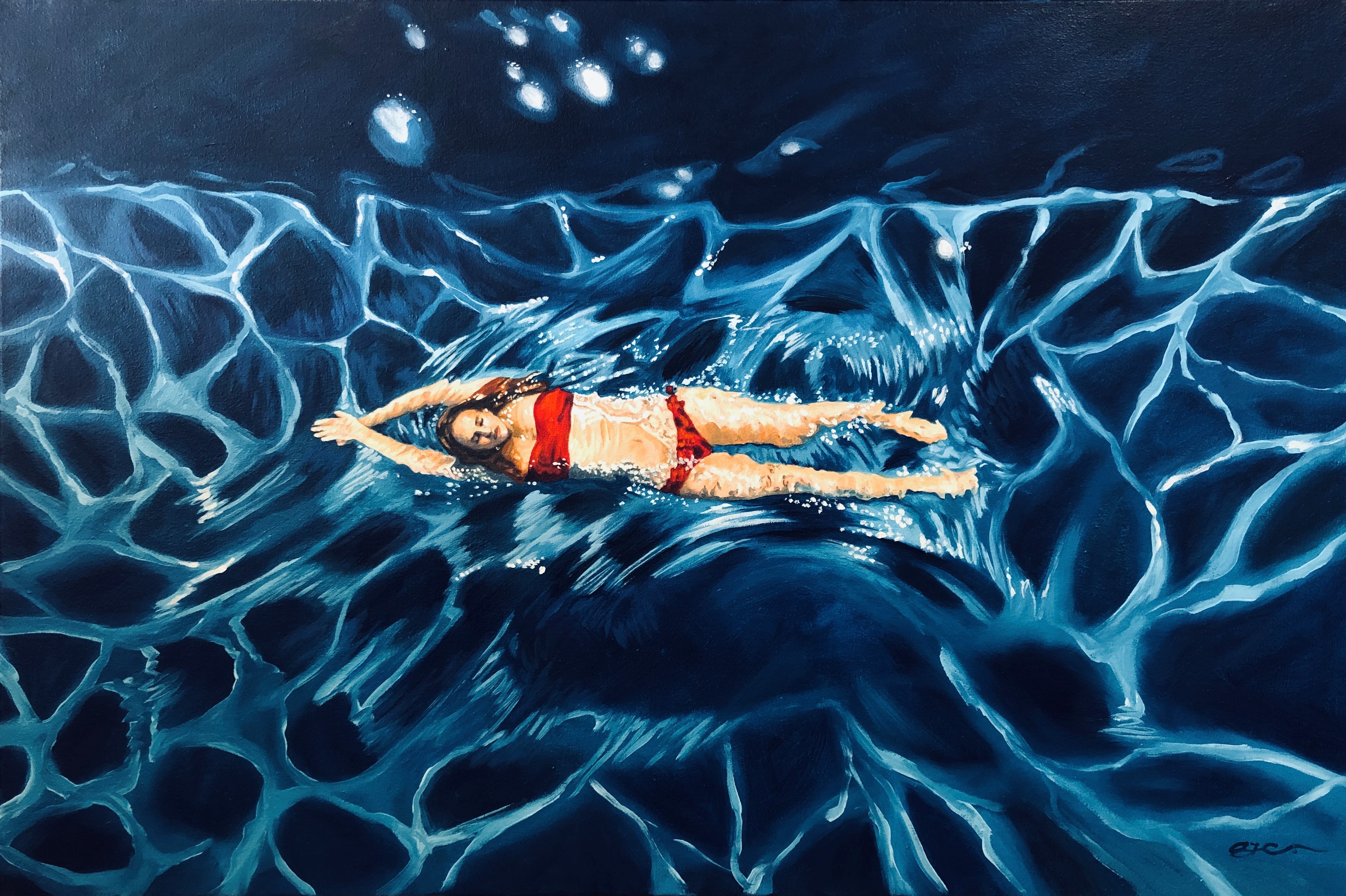 This piece is one of my ‘Swimmer Series’ of paintings and is an investigation into the interaction and connection between light, water and form. Amanda’s work is focused on the quest for finding refuge, quietness and escapism. Some [paintings] focus on the lone swimmer, the few minutes of introspection when submerged in the warm quiet of water, and others investigate the interaction of people within various aspects of the landscape. I haven’t settled on any particular style, and constantly struggle with the juxtaposition between hyper-realism and having a painterly quality to my art and this conflict in my paintings is what I am always trying to balance. This piece is painted in professional quality oil paints on a museum quality canvas, and finished with edges painted and a gloss varnish for protection. It comes with hanging wire and a Certificate of Authenticity.