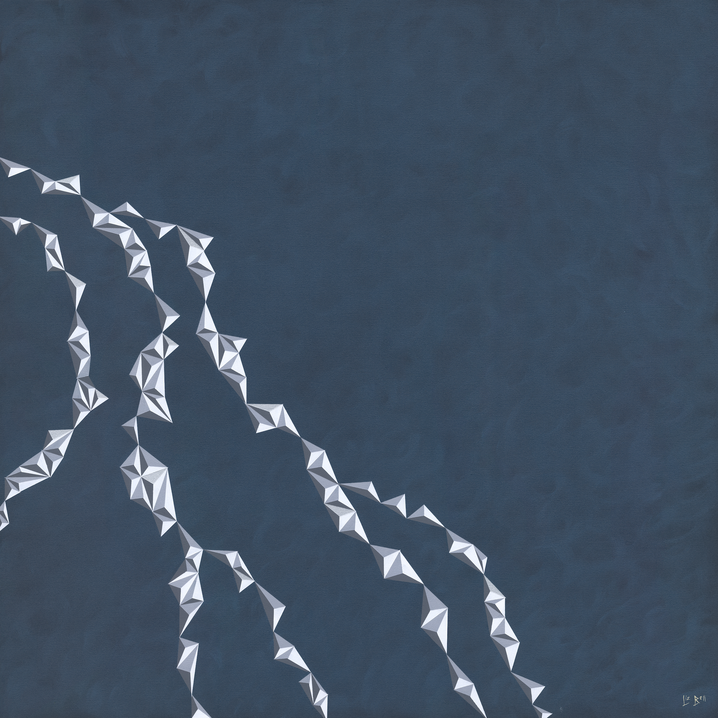 Inspired by the rhythm of the ocean and tidal currents, this piece uses geometric patterns in white/silver/grey to create a feeling of movement, reflective of the ocean tides as they move across the sand.