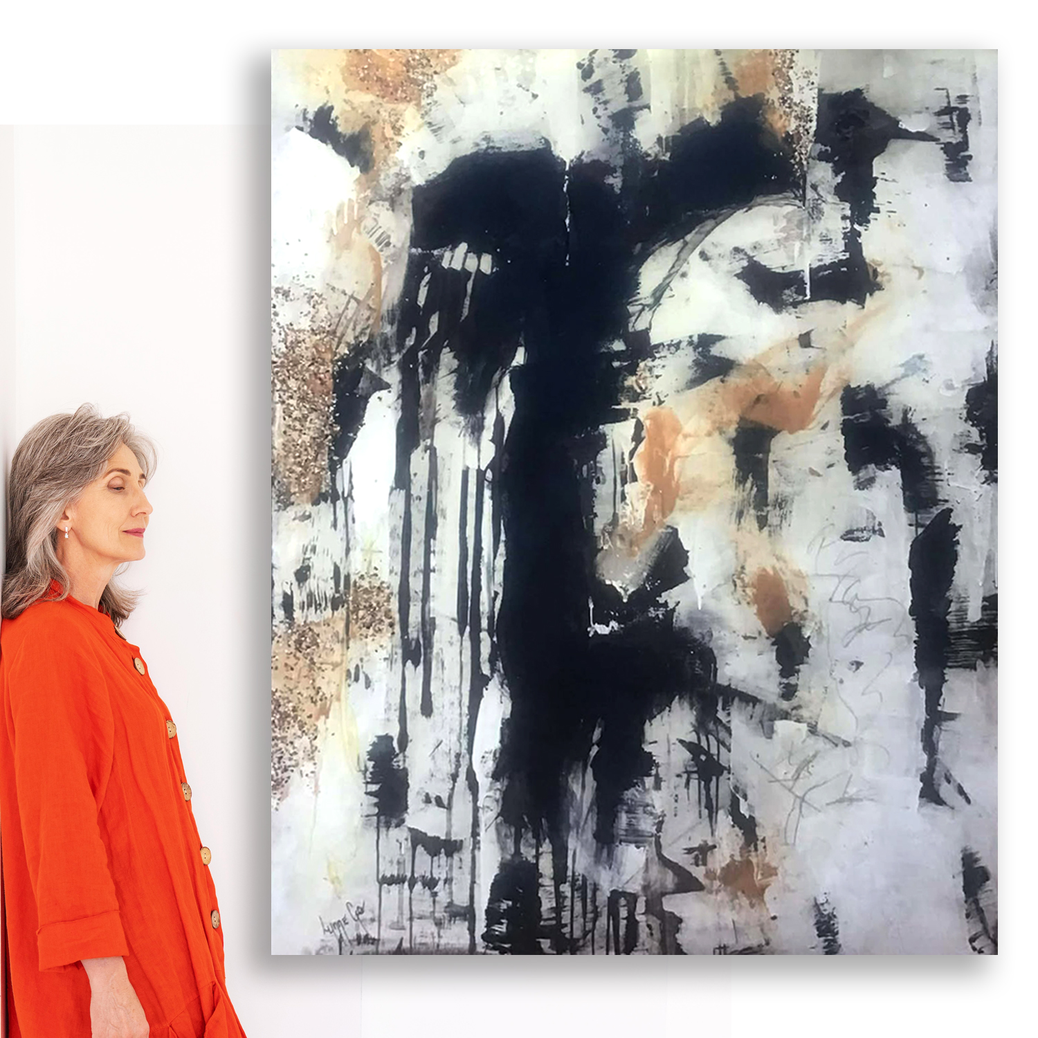 This large mixed media artwork is a bold statement piece, created with acrylics, ink, oil stick and high gloss resin. The various mediums combine to create a striking, disjointed visual with incredible texture, further enhanced by pebble chips. The high gloss resin finish gives the artwork a textured, mirror-like surface, adding to its dramatic effect.