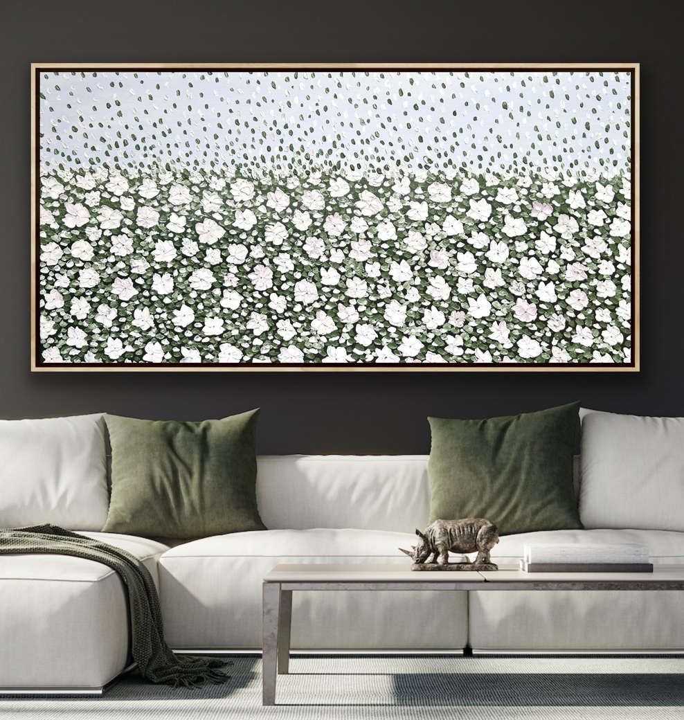 Fragrance of Gardenias by Theo Papathomas a painting with beautiful white colours of gardenias and petals covering the whole field painted with lots of expression and freedom to create movement. Capturing the soft colours of the gardenias and foliage creating a beautiful bouquet of gardenias . A composition of colours and rhythms of petals dancing over the landscape swept by the winds . Painted with a pallet knife to create so much texture with lots of layers of paint . A very peaceful and tranquil painting with so much depth . The painting does not come with an external frame. The painting is signed and dated at the back and comes with a certificate of Authenticity.